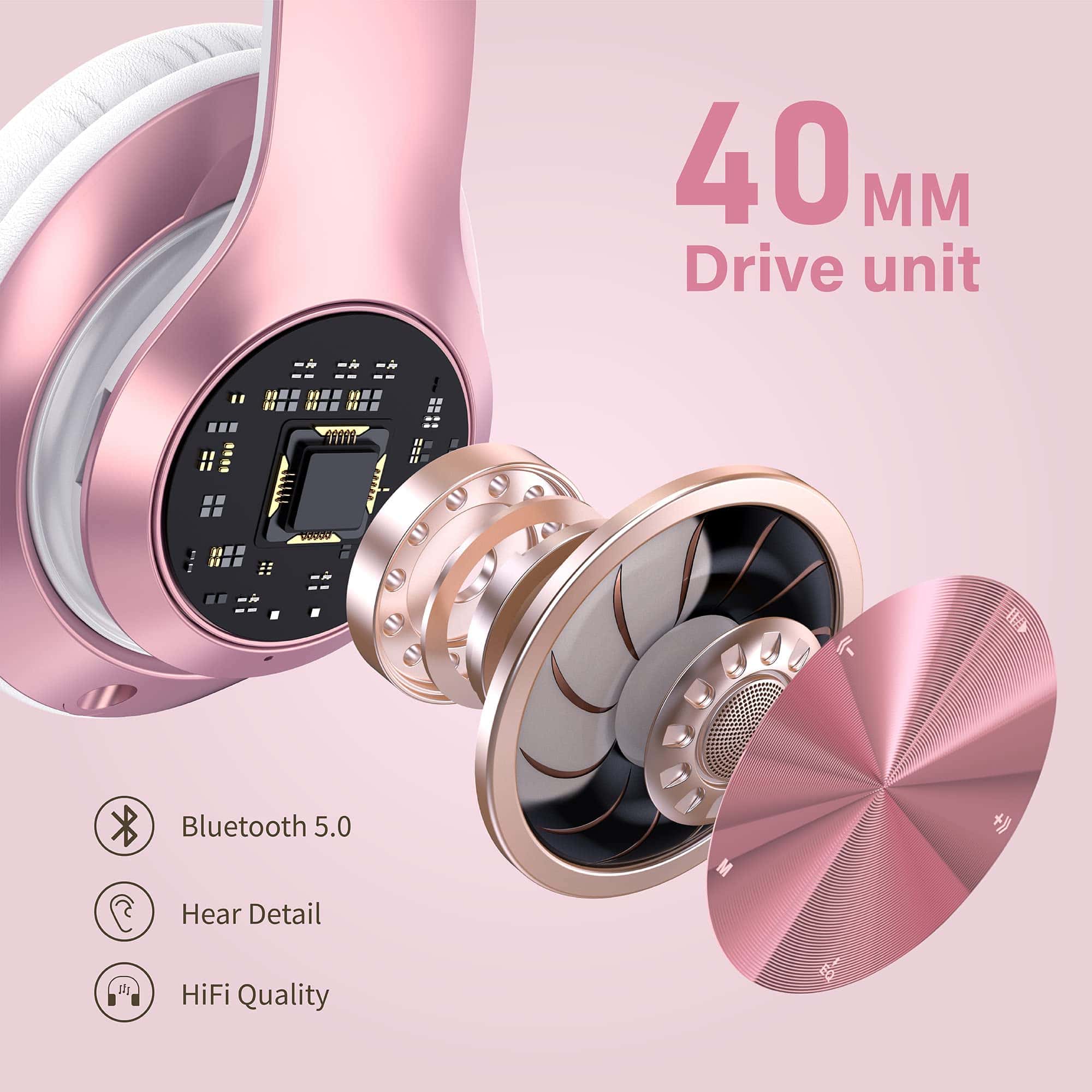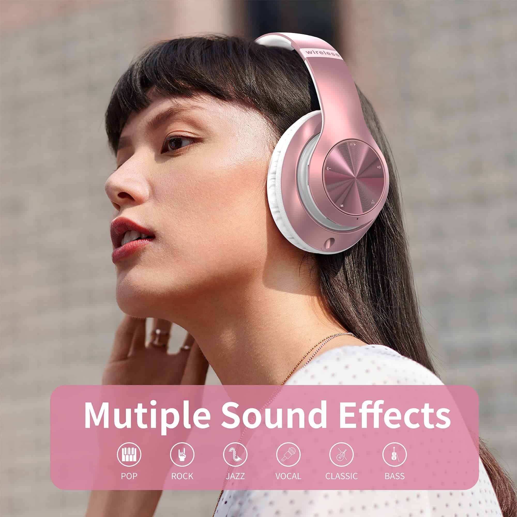 1. HI-FI ESTÉREO Y 6 MODOS DE EQ Nuestros audífonos Bluetooth Over-Ear ofrecen resultados de sonido estéreo de alta fidelidad provenientes de dos drivers de 40 mm y un diseño de almohadillas para los oídos, que combinados ofrecen una calidad de sonido HiFi inmersiva superior. Con 6 modos de EQ, que te permiten cambiar libremente entre sonidos de bajo/Jazz/Voz/Rock/Pop/Clásico, cada modo te proporciona un sonido de calidad de CD.