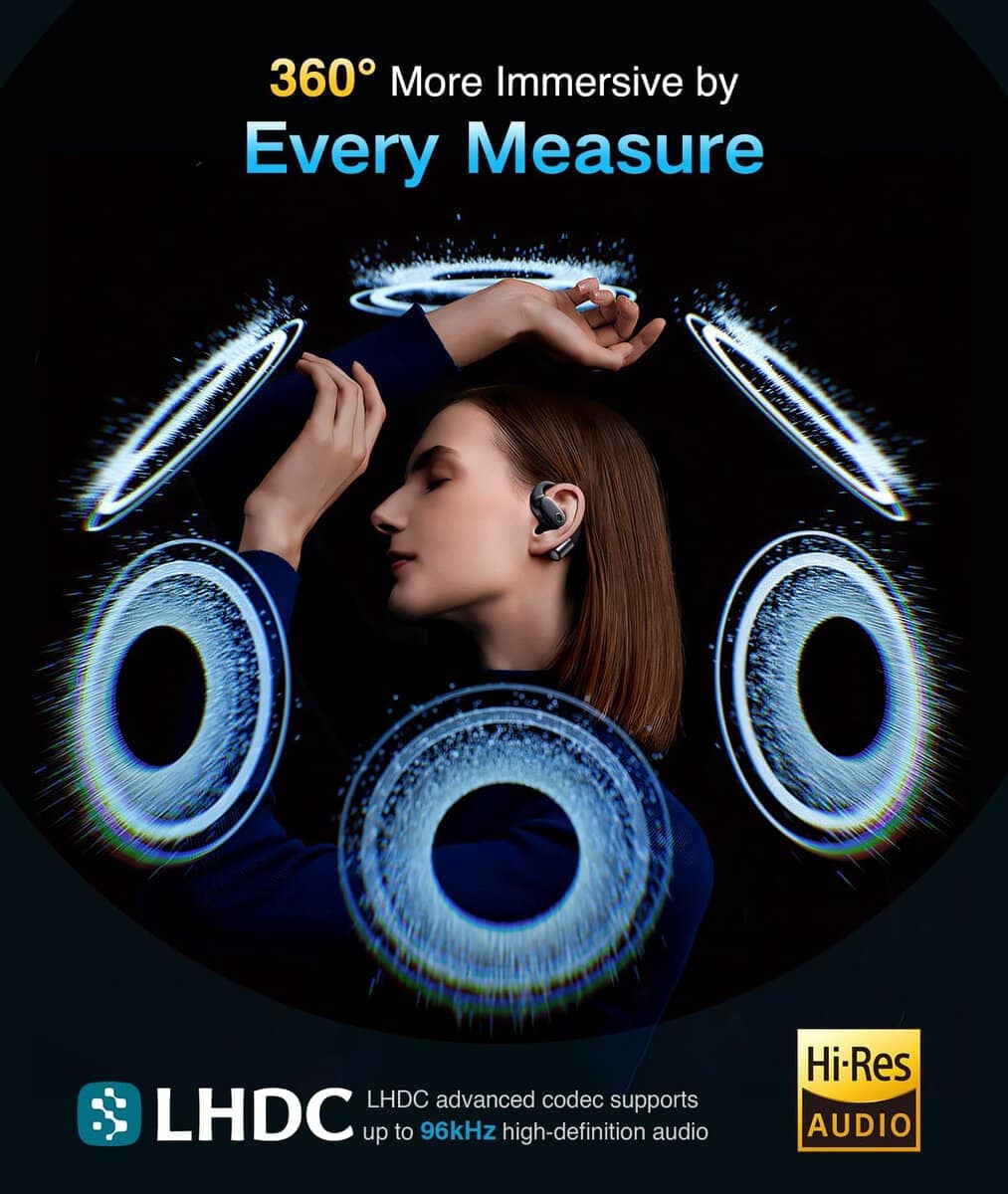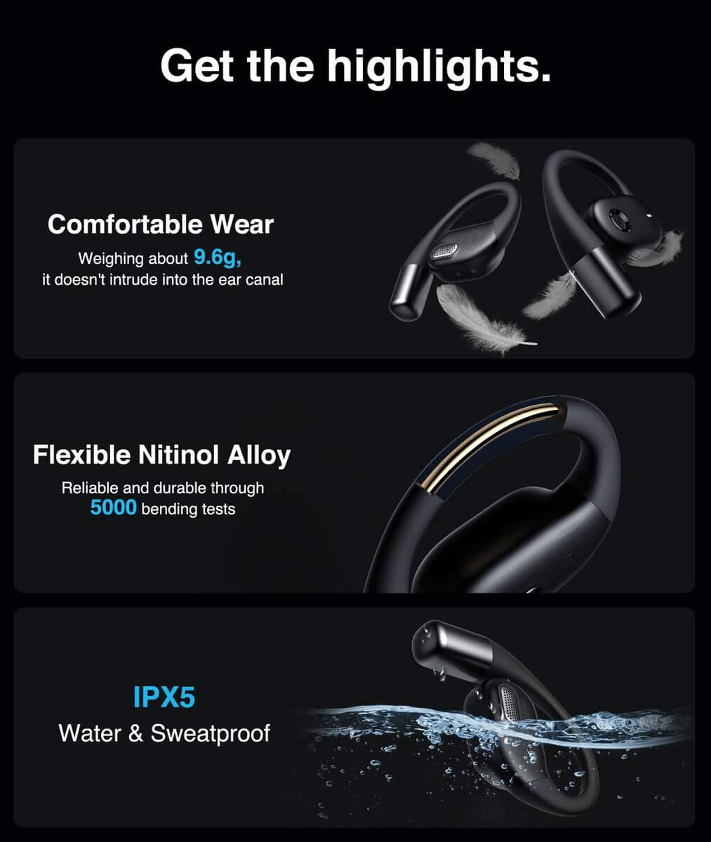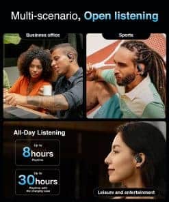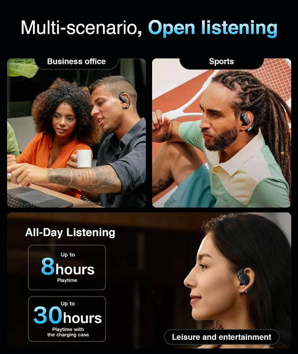 Audífonos inalámbricos de oído abierto, auriculares Bluetooth con micrófono, auriculares de conducción de aire para el hogar, viajes, trabajo y deportes. Disfruta hasta 8 horas con una sola carga y extiéndete a 30 horas con el estuche de carga compacto. ¡Solo 5 minutos de carga rápida dan 1 hora de uso! Resistente al sudor y a salpicaduras, perfecto para entrenamientos, aventuras al aire libre y uso diario. Los ganchos para las orejas ergonómicos y el diseño equilibrado garantizan un ajuste firme y sin presión para sesiones de escucha prolongadas. Experimenta conexiones inalámbricas más rápidas y estables para audio y llamadas sin problemas con Bluetooth 5.3 mejorado. Incluye un práctico llavero para un transporte fácil y un servicio posventa profesional para tranquilidad.