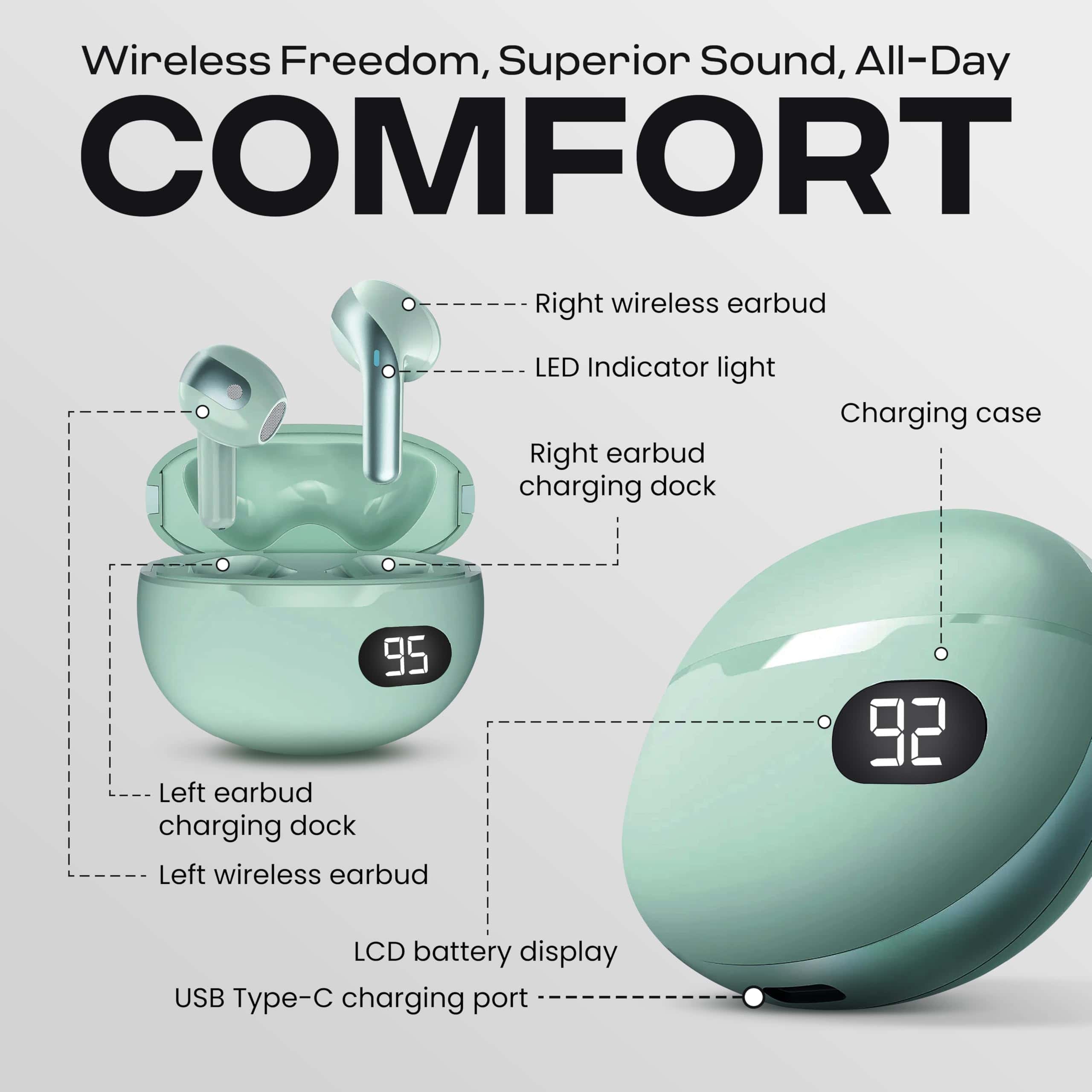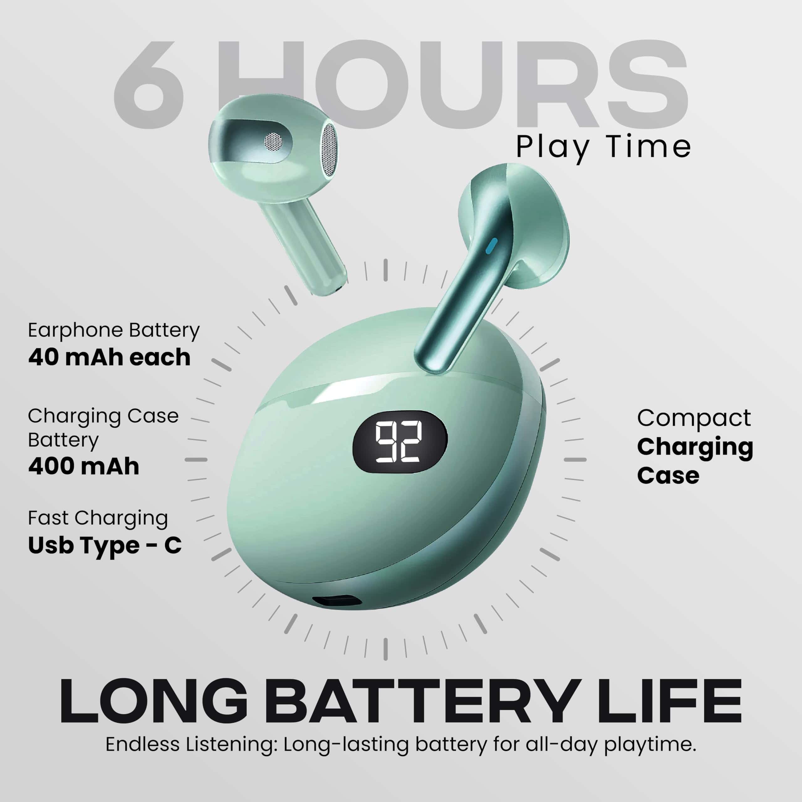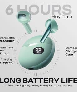1. Diseño compacto y duradero: Diseñado para uso en movimiento, los audífonos Truebuds Bliss vienen con un estuche liviano y recargable por USB-C. Ideal para entrenamientos, viajes y uso diario, con un tiempo de carga de 1 hora para una escucha ininterrumpida. 2. Tecnología Bluetooth 5.0 avanzada: Experimenta una conectividad perfecta con un rango inalámbrico de hasta 10 metros. Disfruta de audio cristalino para música, llamadas y asistentes de voz con la última tecnología Bluetooth. 3. Sonido de alta calidad y especificaciones: Equipados con controladores de 6 mm, una impedancia de 16 Ω y un rango de respuesta de frecuencia de 20 Hz-20 kHz, estos audífonos ofrecen una calidad de sonido superior para una escucha inmersiva. 4. Duración de batería para todo el día y carga rápida: Cada audífono proporciona hasta 4 horas de reproducción, mientras que el estuche de carga USB-C de 400mAh garantiza múltiples recargas. Los indicadores LED te mantienen informado sobre el estado de carga. 5. Controles táctiles intuitivos y asistente de voz: Controla fácilmente la reproducción de música, ajusta el volumen, salta pistas y activa a Siri o Google Assistant con gestos táctiles fáciles de usar en los audífonos.