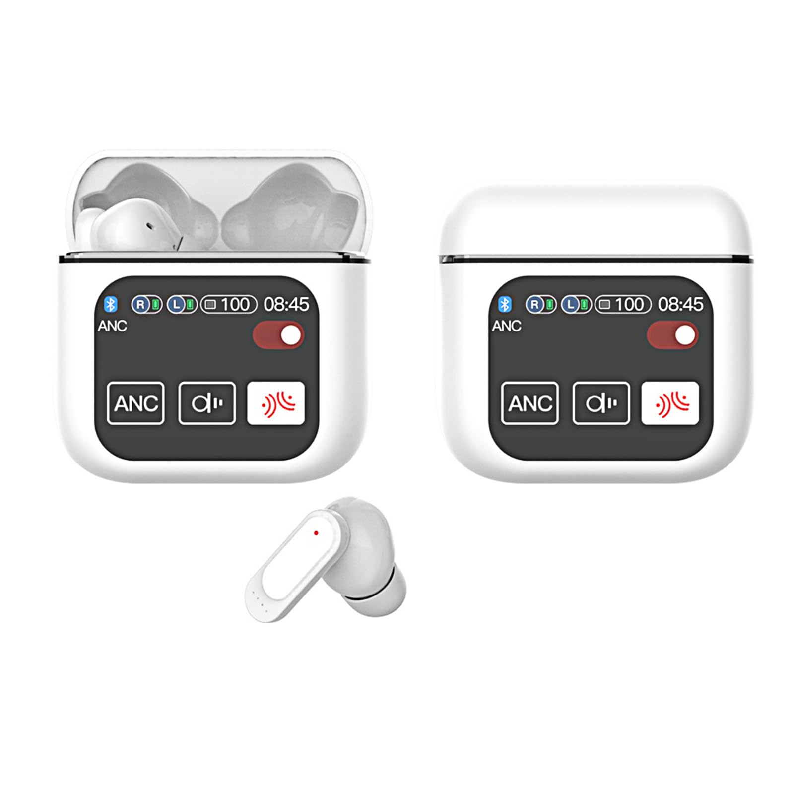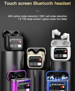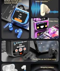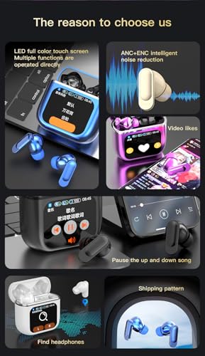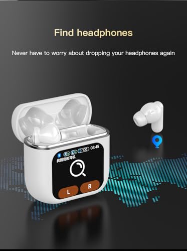 1. Estuche de carga inteligente con pantalla táctil LED: Los auriculares inalámbricos cuentan con una gran pantalla táctil LED que te permite verificar la fecha y la hora, así como mostrar claramente el nivel de batería y el estado de conexión bluetooth de los auriculares y estuche de carga. También tiene ecualizador de música, encontrar auriculares, tomar fotos, ajustar el brillo, ajustar la hora, configurar alarma, ajustar el volumen de la canción y saltar canciones, mostrar letras y otras funciones. Esto facilita mucho la gestión de música y llamadas.