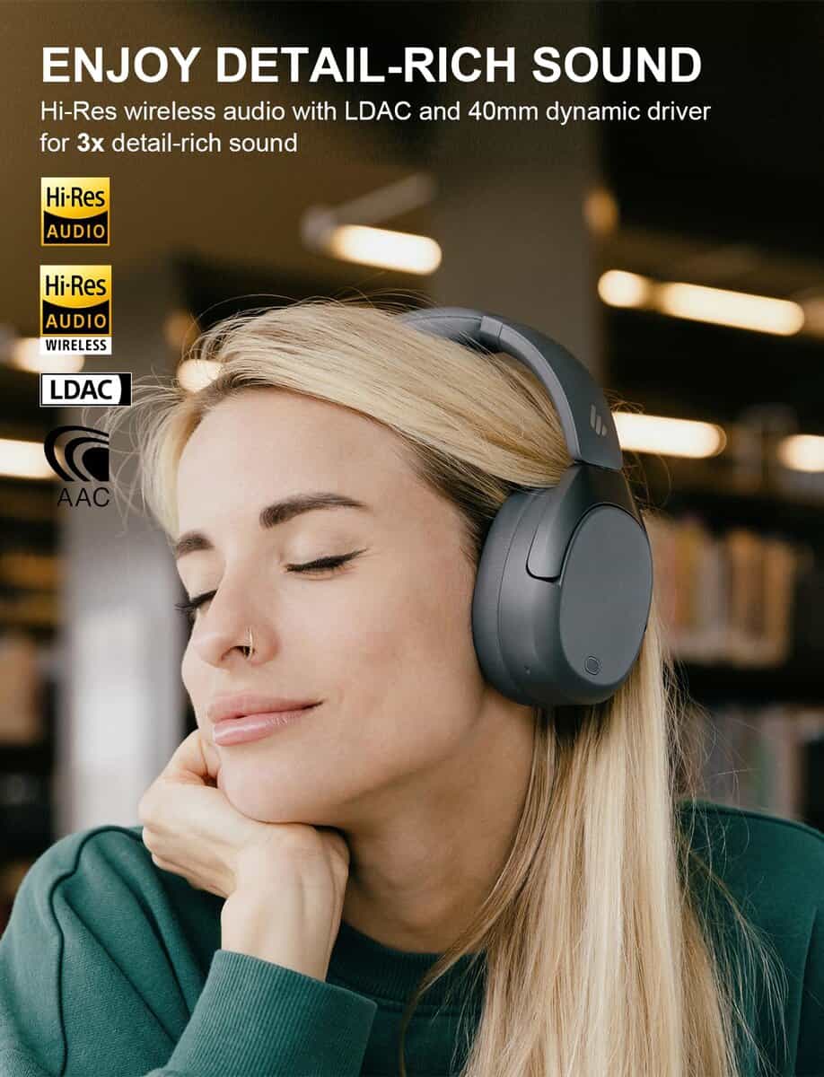 1. Escucha Cada Detalle – Controlador dinámico de 40 mm con códec LDAC para audio inalámbrico Hi-Res, ofreciendo 3 veces más detalle que la transmisión estándar de Bluetooth para bajos potentes y agudos nítidos.