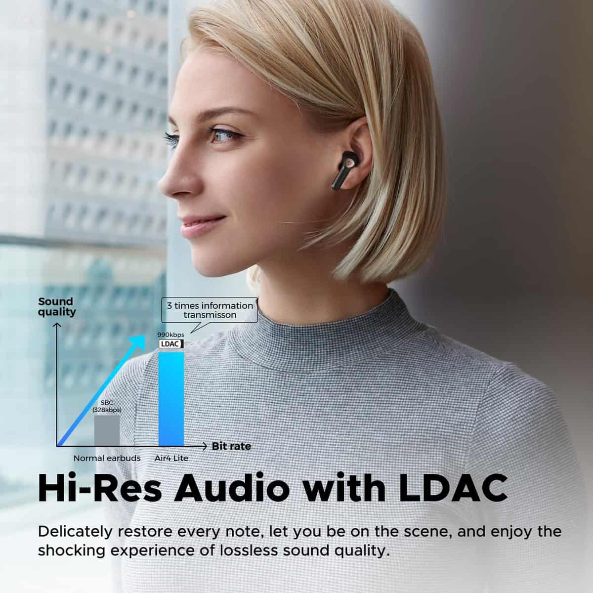 Las auriculares inalámbricos SoundPEATS Air4 Lite te ofrecen una calidad de sonido excepcional y un diseño ergonómico para una experiencia auditiva sin igual. Con un servicio de primera calidad, nuestro equipo de atención al cliente está aquí para resolver cualquier problema que puedas tener, así que no dudes en contactarnos directamente. Disfruta de sonido de alta resolución con LDAC, que te permite experimentar un sonido puro y claro con tasas de bits más altas y tasas de muestreo más altas. El controlador dinámico de 13 mm ofrece bajos profundos, claridad en medios y un escenario de sonido expansivo para una experiencia musical inmersiva. Con Bluetooth 5.3 y conexión multipunto, permanece conectado sin esfuerzo a múltiples dispositivos simultáneamente. Disfruta de hasta 30 horas de reproducción con la funda de carga, que también ofrece una claridad excepcional en las llamadas gracias a los 6 micrófonos y la reducción efectiva del ruido. Los auriculares Air4 Lite también ofrecen funciones como emparejamiento automático y conexión de varios dispositivos para una experiencia de audio sin complicaciones. No dejes que los problemas técnicos te detengan, estamos aquí para brindarte soporte y resolver cualquier inconveniente que puedas encontrar. ¡Experimenta un sonido excepcional con los auriculares SoundPEATS Air4 Lite!