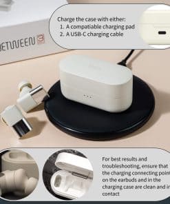 4. Duración de batería excepcional y carga rápida: Los audífonos Between 3ANC ofrecen una impresionante duración de batería de hasta 8 horas con ANC activado, y hasta 12 horas con ANC desactivado. El estuche de carga rápida USB-C incluido proporciona 24 horas adicionales de energía. Con solo 15 minutos de carga, los usuarios pueden disfrutar hasta 2 horas de reproducción. Para asegurar que ambos audífonos se carguen correctamente, asegúrate de que estén colocados correctamente en el estuche y que el punto de conexión en la carga y el audífono esté limpio.