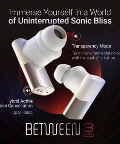 2. Cancelación de ruido activa de vanguardia: Estos audífonos inalámbricos cuentan con una tecnología avanzada de ANC con tres modos ajustables: Transparencia, Cancelación de ruido y Ambiente. Esto permite a los usuarios personalizar su experiencia auditiva según su entorno, ya sea en una ciudad bulliciosa o en una habitación tranquila. El Between 3ANC bloquea eficazmente el ruido no deseado, garantizando una experiencia auditiva inmersiva y libre de distracciones.
