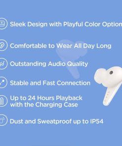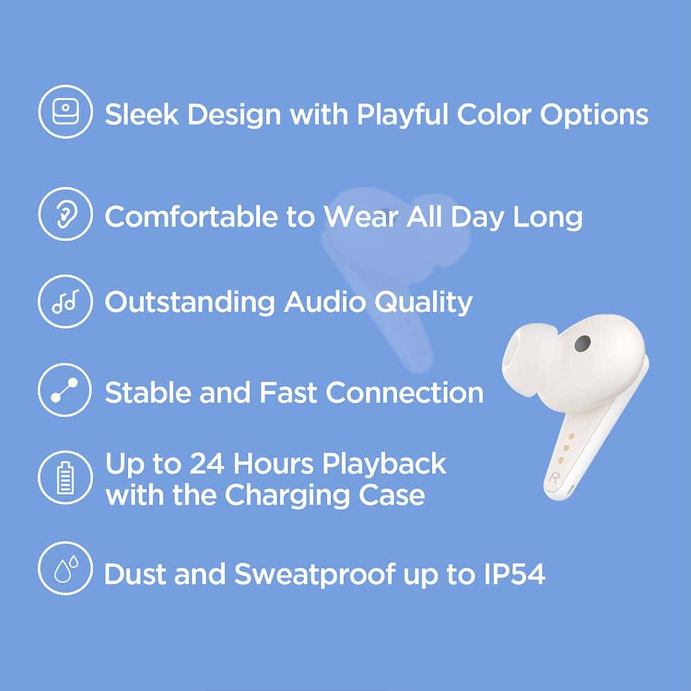 5. MÁS CARACTERÍSTICAS: Hasta 8 horas de uso con una carga completa y hasta 24 horas con el estuche de carga. Resistente al polvo y al agua hasta IP54. Soporta 3 dispositivos conectados. Llamadas claras con reducción de ruido ambiental.