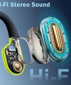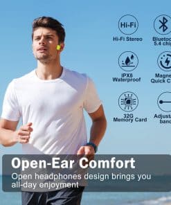 1. Audífonos de conducción ósea abiertos: A diferencia del diseño tradicional, nuestros audífonos bluetooth abiertos no cubrirán completamente tus oídos, por lo que podrás usarlos durante mucho tiempo y seguir sintiéndote cómodo. Los audífonos para nadar también garantizan tu seguridad mientras nadas, haces snorkel, andas en bicicleta, haces senderismo y otras actividades al aire libre. Nota: El modo Bluetooth no es compatible bajo el agua.