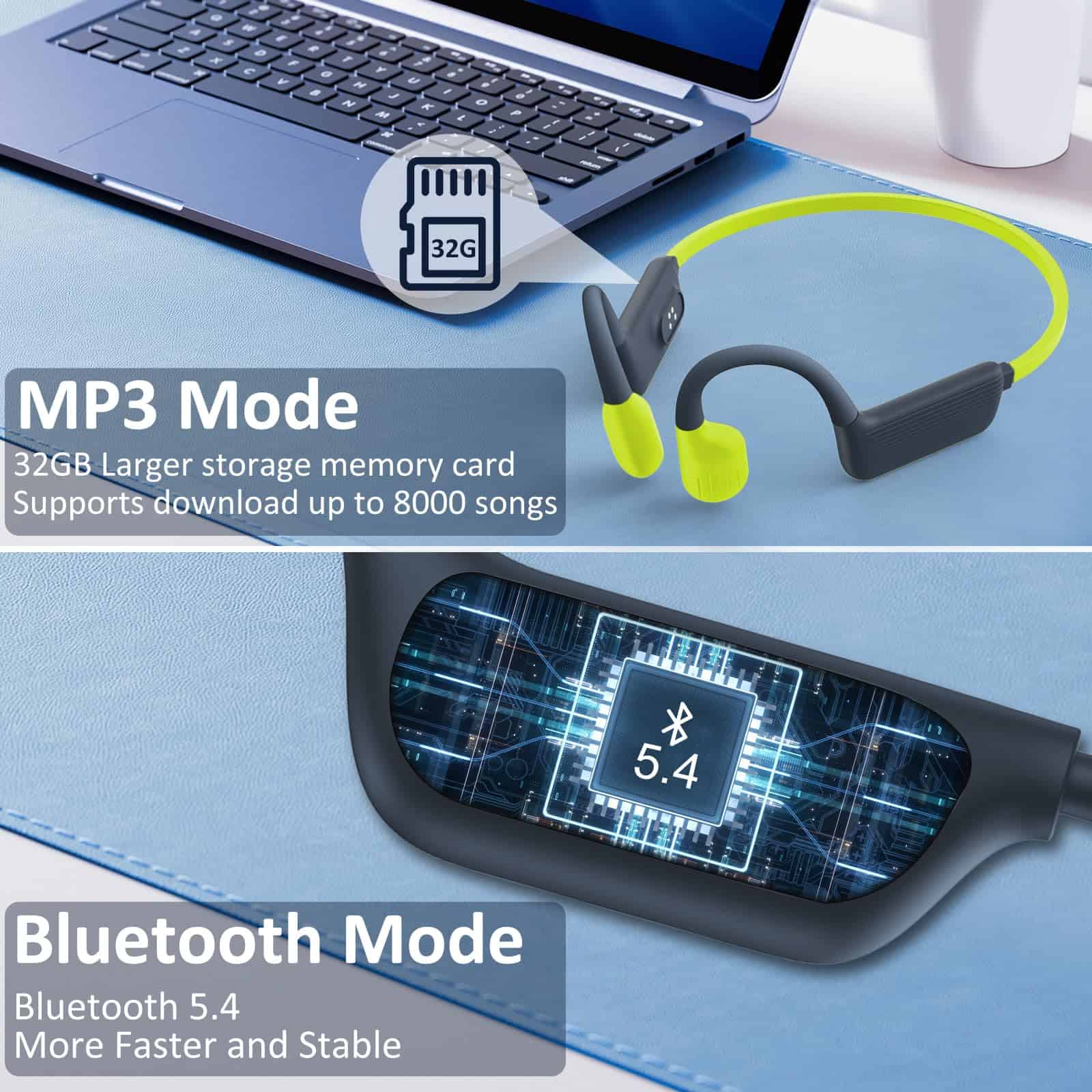 3. Modo dual MP3 y Bluetooth: Estos versátiles audífonos subacuáticos cuentan con conectividad Bluetooth y memoria interna de 32GB (almacena aproximadamente entre 5,000-8,000 canciones). Disfruta de tu música sin conexión en diferentes escenarios sin necesidad de tu teléfono en modo MP3. Nota: Haz doble clic en el botón multifunción para cambiar entre el modo Bluetooth y el modo MP3.