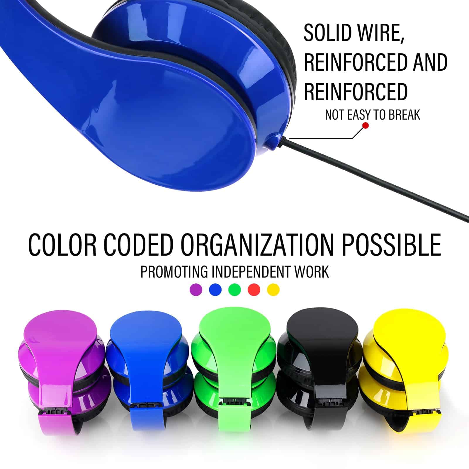 3. Ofrecemos nuestros auriculares en varias opciones de color; ¡adiós a tonos aburridos y sin vida! Además, cada par de nuestros audífonos tiene un puerto de 3.5mm que se puede enchufar en cualquier tableta, teléfono, PC, Chromebook u otro dispositivo inteligente.