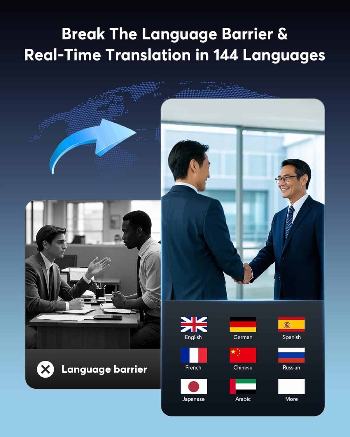Audífonos Traductores Azul Marino Traducción en Tiempo Real en 144 Idiomas Experimenta una comunicación perfecta en todo el mundo con nuestros Audífonos Traductores Azul Marino. Diseñados para viajeros, profesionales de negocios y estudiantes de idiomas, estos audífonos de vanguardia ofrecen traducción en tiempo real en 144 idiomas, garantizando conversaciones fluidas donde quiera que vayas. Características Clave: Traducción Bidireccional Instantánea Comunícate sin esfuerzo en tiempo real con traducciones ultrarrápidas impulsadas por IA. Soporte para 144 Idiomas Habla y comprende una amplia gama de idiomas para una conectividad global. Audio Cristalino La tecnología avanzada de cancelación de ruido garantiza conversaciones claras en cualquier entorno. Vida Útil de Batería Prolongada Disfruta de un uso prolongado con una potente batería que dura horas con una sola carga. Ajuste Elegante y Cómodo Diseño elegante en azul marino con un ajuste ergonómico para una comodidad durante todo el día. Funcionalidad Multi-Modo Utiliza el modo de conversación, modo de conferencia o modo sin conexión para diferentes escenarios. Conectividad Bluetooth Se empareja perfectamente con tu smartphone para una experiencia fácil y fluida. Rompe las barreras del idioma y conéctate con el mundo como nunca antes. Ya sea que estés viajando, trabajando o aprendiendo, estos inteligentes audífonos traductores son tu compañero definitivo. ¡Consigue los tuyos hoy y desbloquea el poder de la comunicación global!