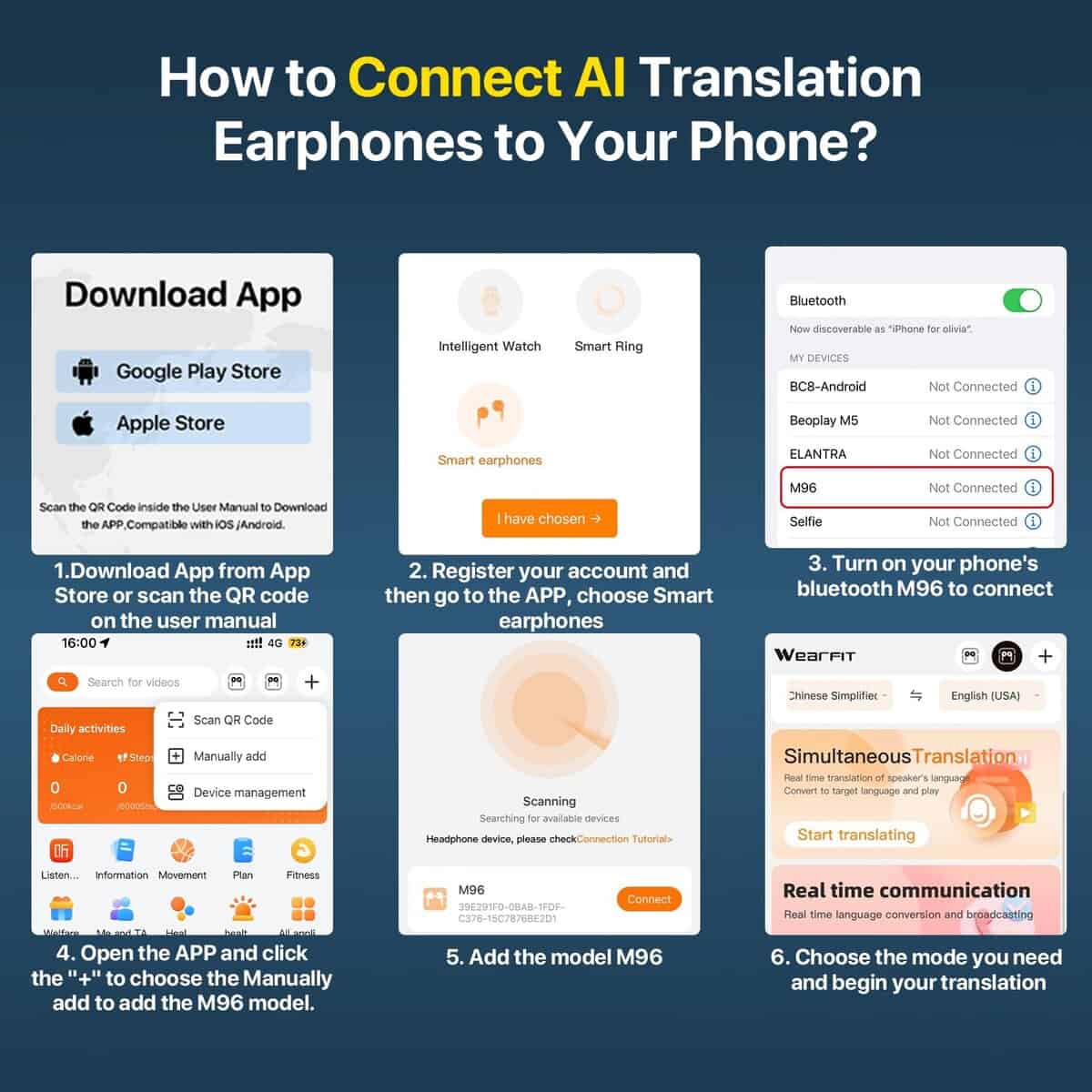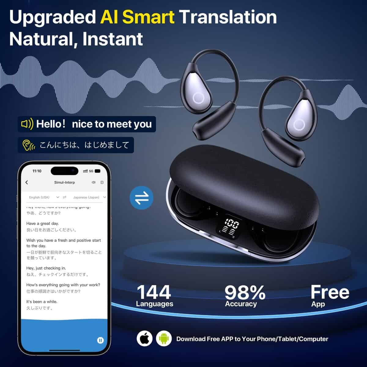 5. Diseño ergonómico para una comodidad durante todo el día. El diseño elegante, ligero y ergonómico garantiza un ajuste seguro y cómodo incluso durante un uso prolongado, proporcionando una experiencia de uso sin presiones. Diseñado para la durabilidad y comodidad, los audífonos traductores de oído abierto son perfectos para reuniones de negocios largas, viajes o uso personal.