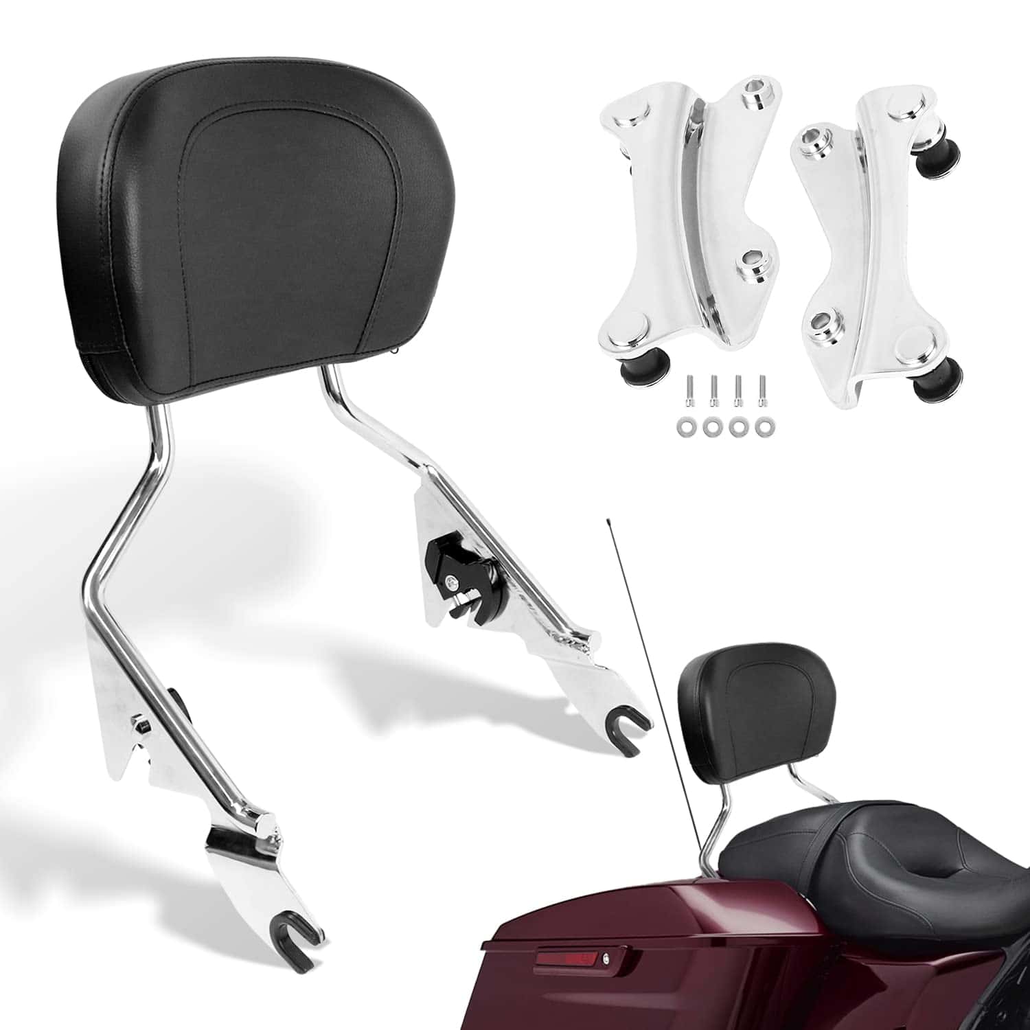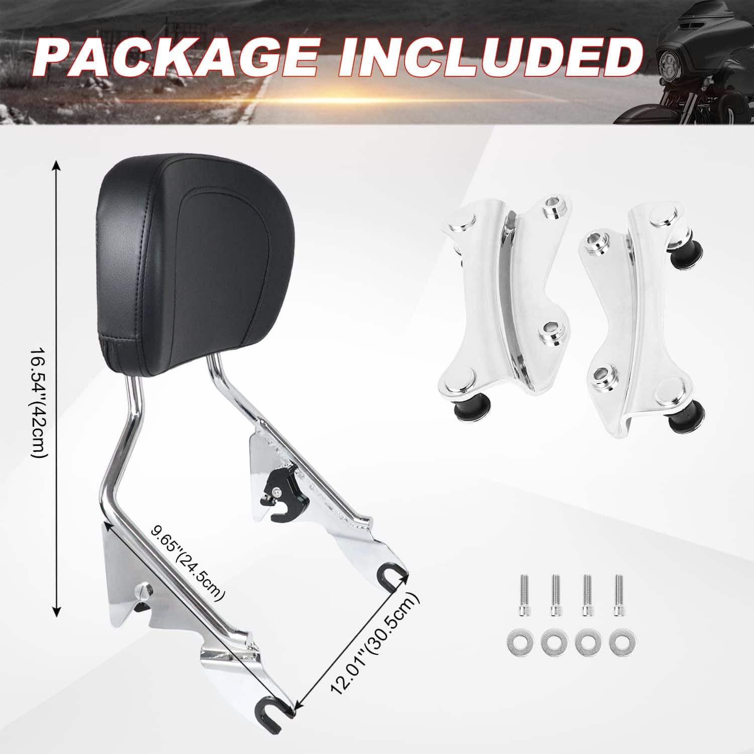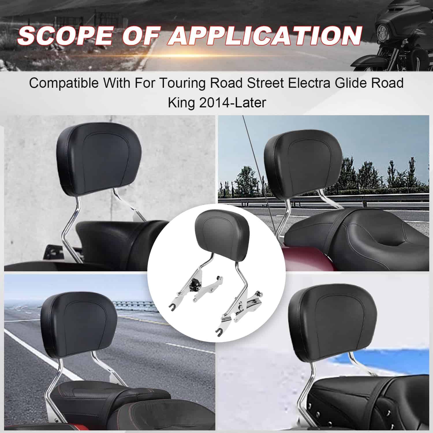 El respaldo es compatible con Touring 2014 y posteriores. Compatible con Road King FLHR y Road King Classic FLHRC, compatible con Street Glide FLHX y Street Glide Special FLHXS, compatible con CVO Street Glide FLHXSE, compatible con Screamin Eagle Street Glide FLHXSE2, compatible con CVO Screamin Eagle Street Glide FLHXSE3 (NO compatible con Trike y los modelos CVO posterior a 2009 con Tour-Pak de montaje rígido y modelos 2014 con Tour-Pak de montaje rígido). Compatible con Electra Glide Standard FLHT, Electra Glide Ultra Limited FLHTK, Ultra Electra Glide Standard FLHTC, Ultra Classic Electra Glide Standard FLHTCU, Road Glide FLTR, Road Glide Ultra FLTRU, Road Glide Custom FLTRX, CVO Road Glide Ultra FLTRUSE, CVO Road Glide Custom FLTRXSE, etc. Paquete incluye 1 Respaldo desmontable con sissy bar (clip de cierre de estante de equipaje incluido) + 2 kit de hardware de anclaje de 4 puntos. Para FLHTC, FLHTCU, FLHTK, FLTRU y modelos equipados con Tour-Pak de montaje rígido de equipo original requieren el Kit de Estante de Tour-Pak Desmontable P/N 53246-09A (18 meses de garantía de calidad).