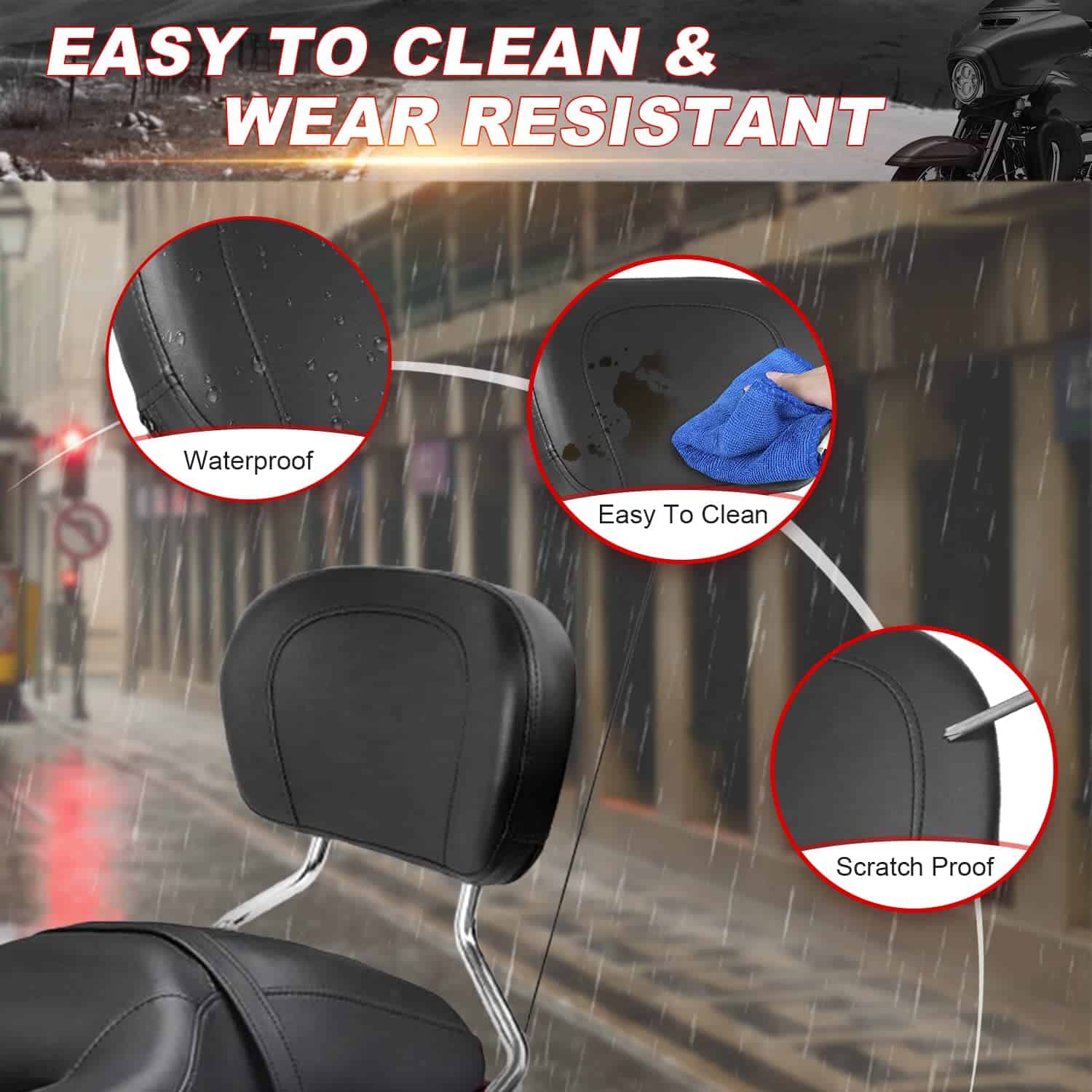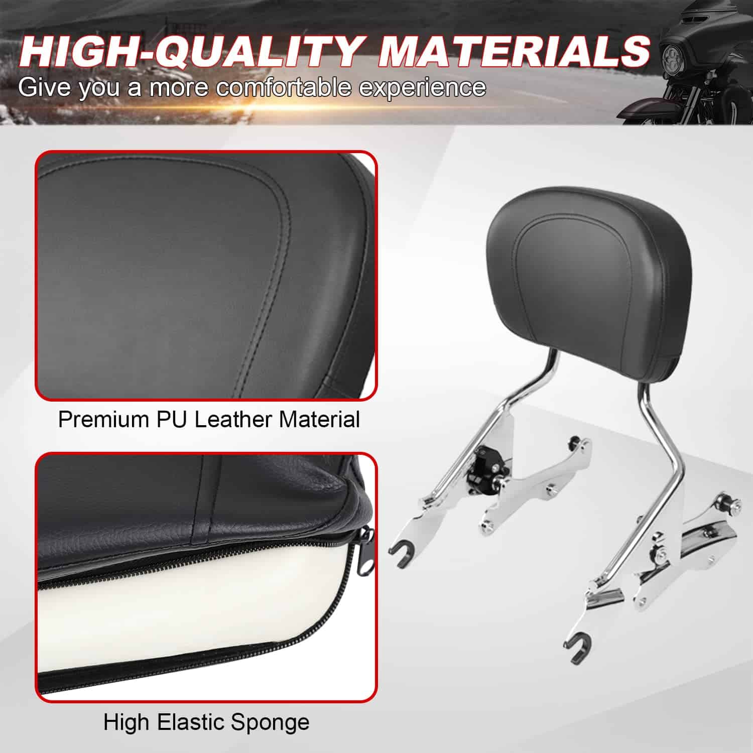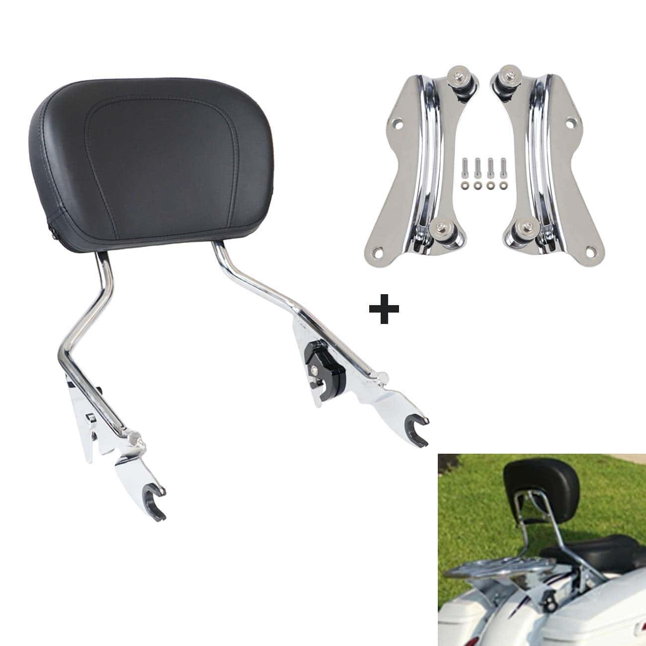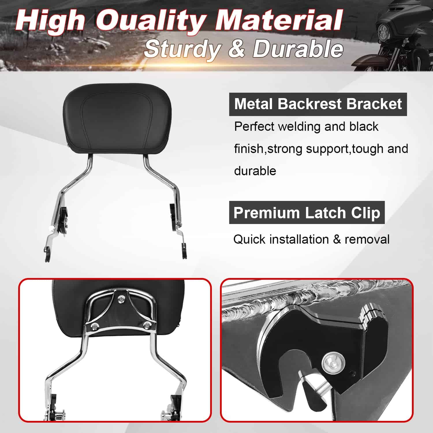 El respaldo es compatible con Touring 2014 y posteriores. Compatible con Road King FLHR y Road King Classic FLHRC, compatible con Street Glide FLHX y Street Glide Special FLHXS, compatible con CVO Street Glide FLHXSE, compatible con Screamin Eagle Street Glide FLHXSE2, compatible con CVO Screamin Eagle Street Glide FLHXSE3 (NO compatible con Trike y los modelos CVO posterior a 2009 con Tour-Pak de montaje rígido y modelos 2014 con Tour-Pak de montaje rígido). Compatible con Electra Glide Standard FLHT, Electra Glide Ultra Limited FLHTK, Ultra Electra Glide Standard FLHTC, Ultra Classic Electra Glide Standard FLHTCU, Road Glide FLTR, Road Glide Ultra FLTRU, Road Glide Custom FLTRX, CVO Road Glide Ultra FLTRUSE, CVO Road Glide Custom FLTRXSE, etc. Paquete incluye 1 Respaldo desmontable con sissy bar (clip de cierre de estante de equipaje incluido) + 2 kit de hardware de anclaje de 4 puntos. Para FLHTC, FLHTCU, FLHTK, FLTRU y modelos equipados con Tour-Pak de montaje rígido de equipo original requieren el Kit de Estante de Tour-Pak Desmontable P/N 53246-09A (18 meses de garantía de calidad).