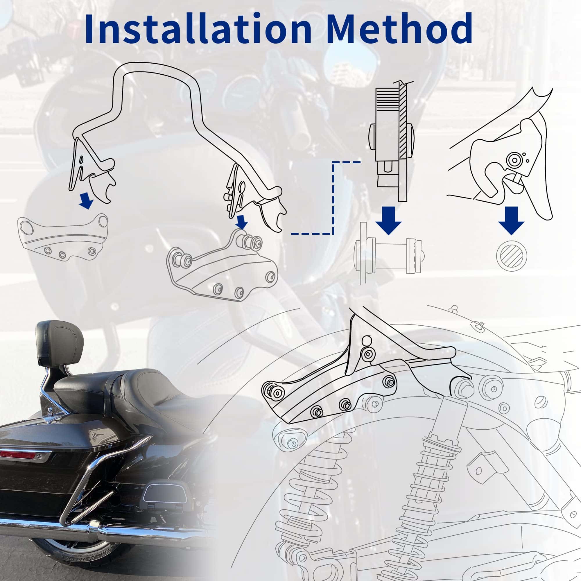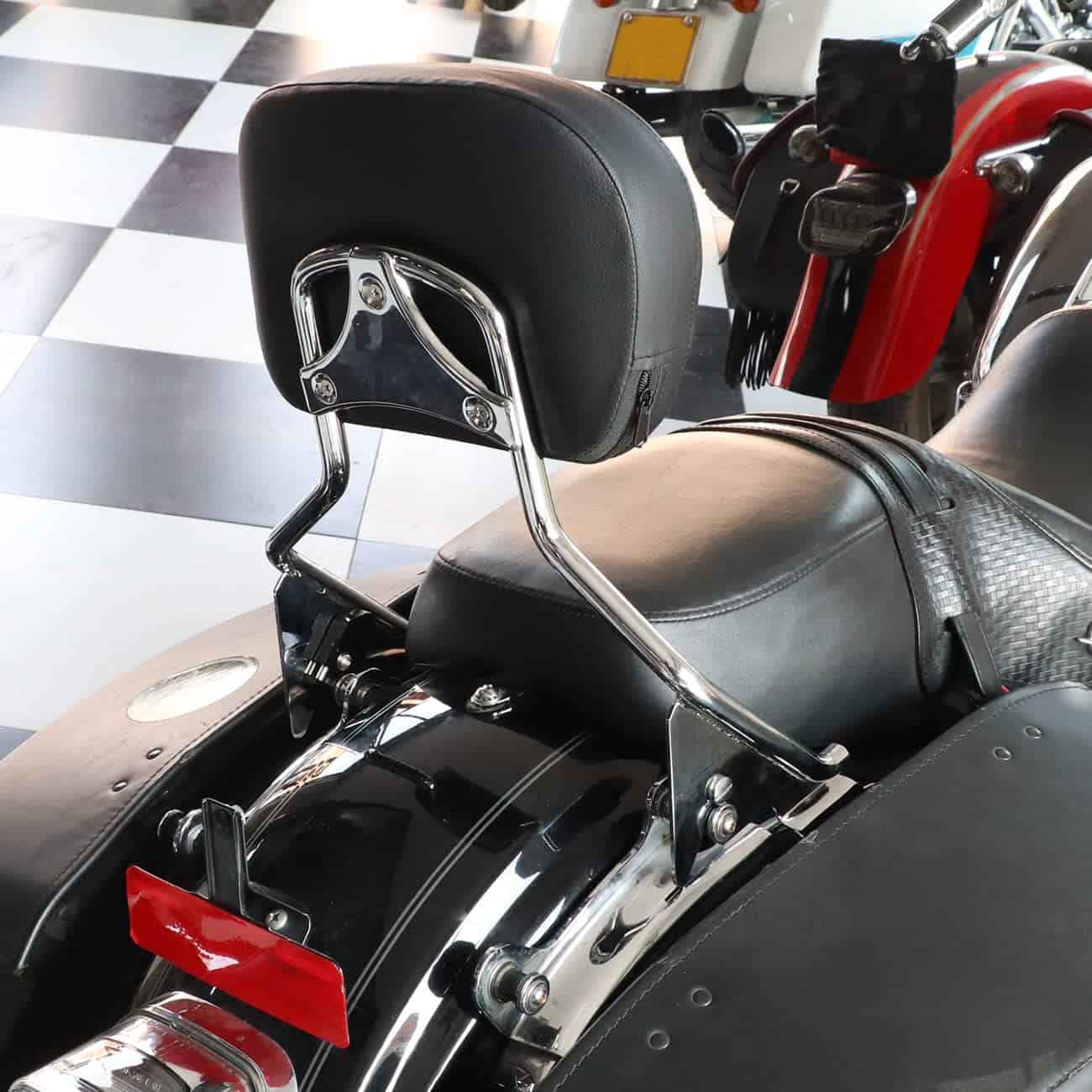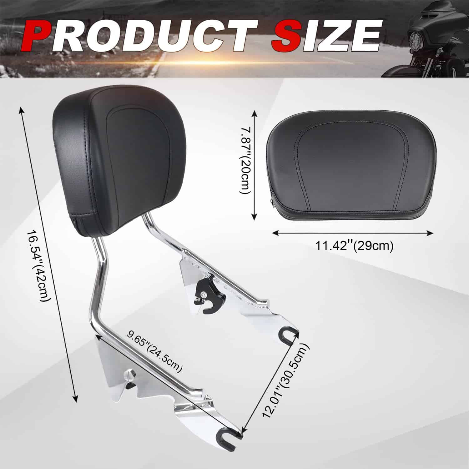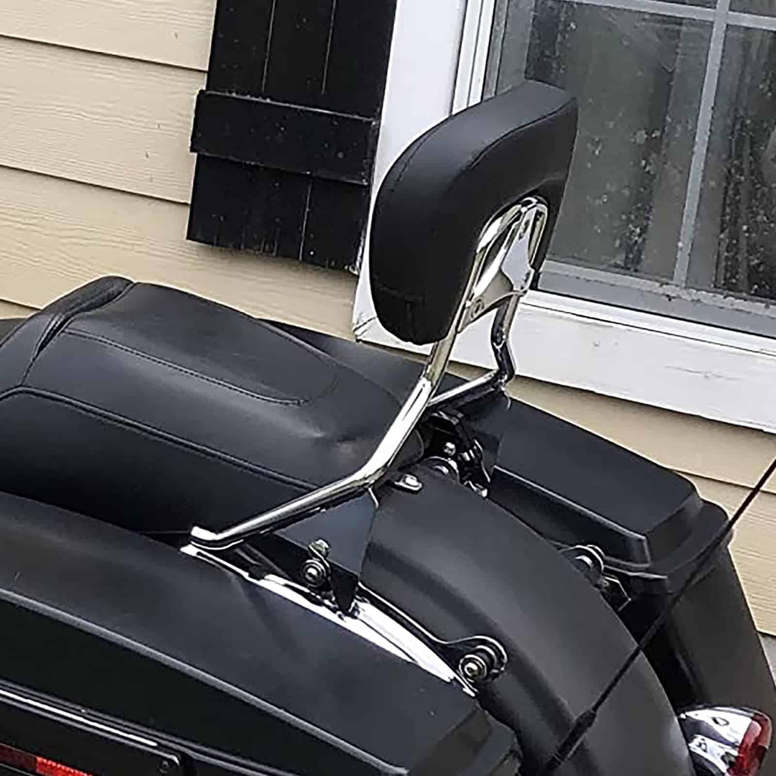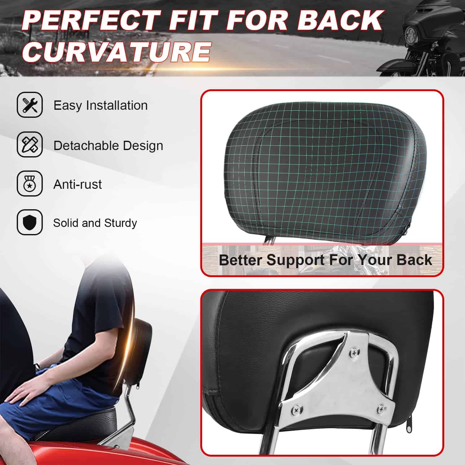 Respaldo sissy bar de alta calidad fabricado en metal resistente y duradero. La almohadilla del respaldo con cremallera te brinda conveniencia para el desmontaje, fabricada en cuero PU de alta calidad y transpirable, con esponja incorporada, proporciona suficiente soporte lumbar para los pasajeros, mejorando la comodidad de viajes prolongados. Compatible con modelos Touring 2009 en adelante, Road King FLHR, Road King Classic FLHRC, Street Glide FLHX, Street Glide Special FLHXS, CVO Street Glide FLHXSE, Screamin Eagle Street Glide FLHXSE2, CVO Screamin Eagle Street Glide FLHXSE3, etc. Debe estar equipado con los Kits de Montaje de Hardware de Atraque requeridos (NO INCLUIDOS). Incluye 1 Respaldo Desmontable Sissy Bar (Clip de Cierre de Portaequipajes incluido). Perfecto para decorar tu motocicleta.