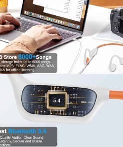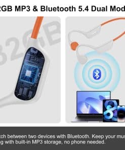 1. Auriculares de 32GB reproductor de MP3 & Bluetoeth 5.4 inalámbricos para natación con doble modo de conmutación, lo último en bluetoeth 5.4 y tarjeta de memoria TF de 32GB incorporada. Señal estable y conexión rápida. Ya sea que estés nadando, corriendo, andando en bicicleta, haciendo senderismo, conduciendo, puedes disfrutar de tu música favorita en cualquier lugar. Los auriculares de conducción ósea están diseñados para la comodidad y un ajuste seguro, asegurando que permanezcan en su lugar durante el ejercicio, permitiéndote disfrutar de la música mientras te ejercitas. 3. Conducción ósea y más seguroLos auriculares de natación de conducción ósea están hechos de silicona suave y pesan solo 30g para una comodidad durante todo el día. A diferencia de los auriculares tradicionales, el auricular abierto evita el estrés y la incomodidad por usarlos durante mucho tiempo, y no interferirá con sombreros o gafas. Mantente al tanto de tu entorno mientras disfrutas de la música, ideal para actividades tanto en interiores como al aire libre como correr, andar en bicicleta, caminar, hacer ejercicio y viajar, asegurando la seguridad donde quiera que vayas. 4. Larga duración de la batería y botones multifuncionales El auricular bluetoeth tiene una batería grande de 200mAh. Disfruta hasta 8 horas de reproducción o tiempo de conversación con una sola carga de 2 horas. El diseño de botones multifuncionales te permite cambiar fácilmente entre 2 modos, reproducir, pausar, canciones anteriores/siguientes y responder/finalizar llamadas, brindándote una experiencia de uso conveniente. 5. Excelente calidad de sonido Los auriculares de natación te ofrecen una excelente calidad de sonido bajo el agua. Con tecnologías cuidadosamente optimizadas que enfatizan el sonido preciso de baja frecuencia e interferencia hidrodinámica. Aún puedes disfrutar de música clara y de alta calidad en el agua.