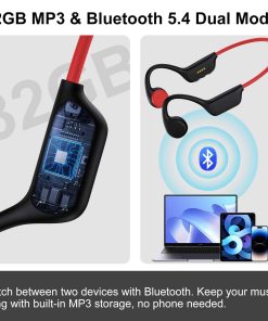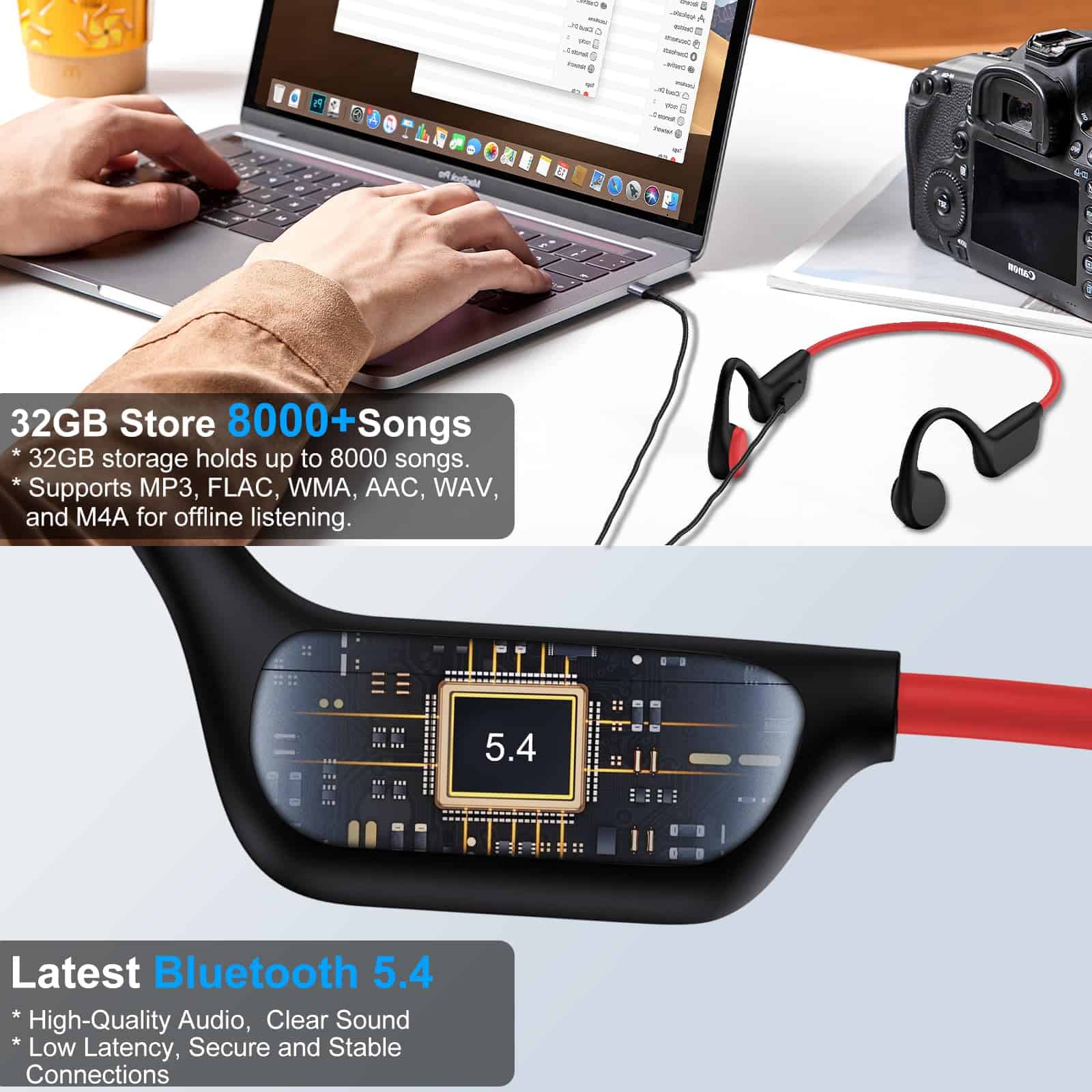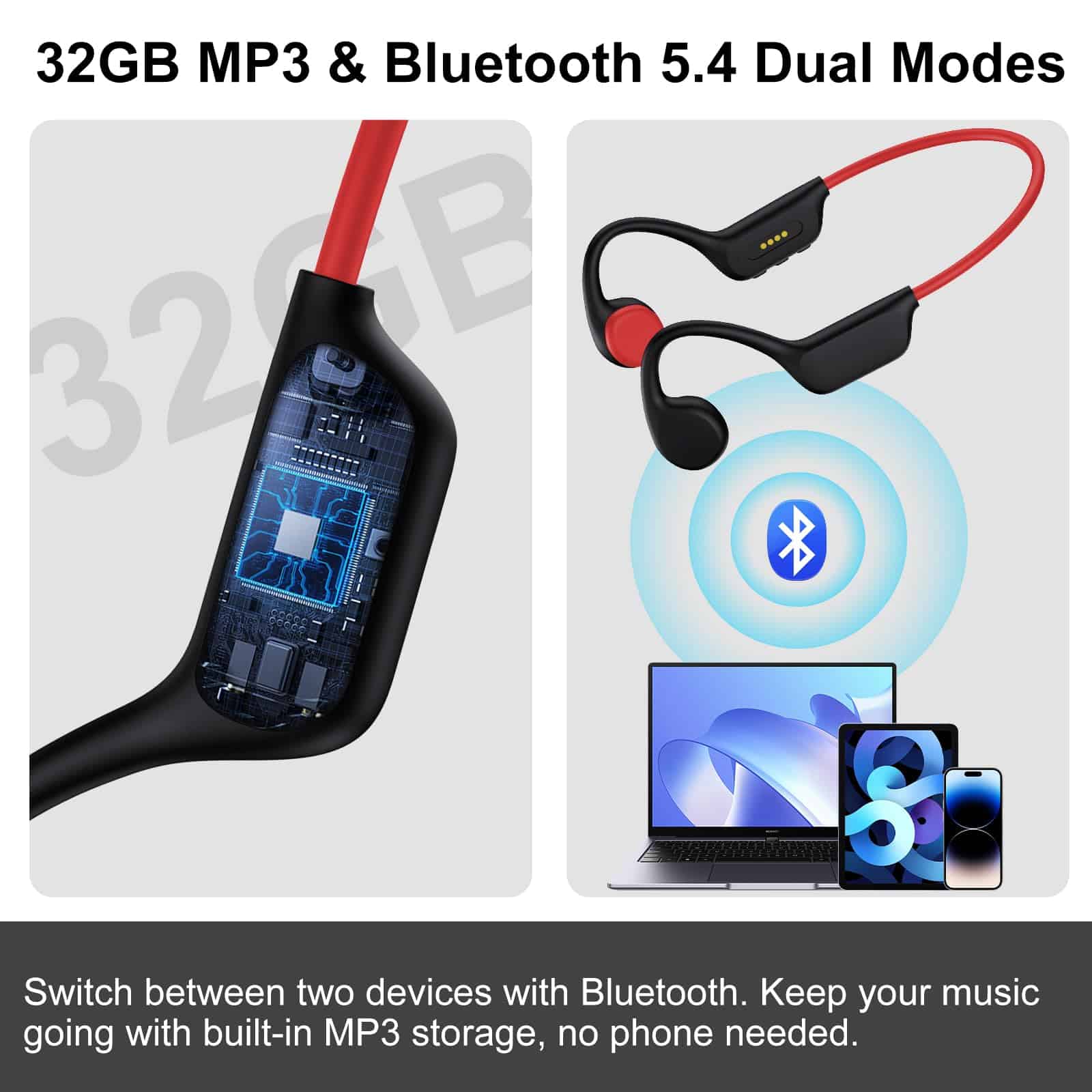 2. Reproductor de MP3 de 32 GB y Bluetoeth 5.4 inalámbricos: los auriculares de natación tienen dos modos para cambiar, el último Bluetoeth 5.4 y una tarjeta de memoria TF de 32GB integrada. Señal estable y conexión rápida. Ya sea que estés nadando, corriendo, ciclando, caminando, conduciendo, puedes disfrutar de tu música favorita en cualquier lugar. Los auriculares de conducción ósea están diseñados para mayor comodidad y ajuste seguro, asegurando que se mantengan en su lugar durante el ejercicio, permitiéndote disfrutar de la música mientras haces ejercicio.