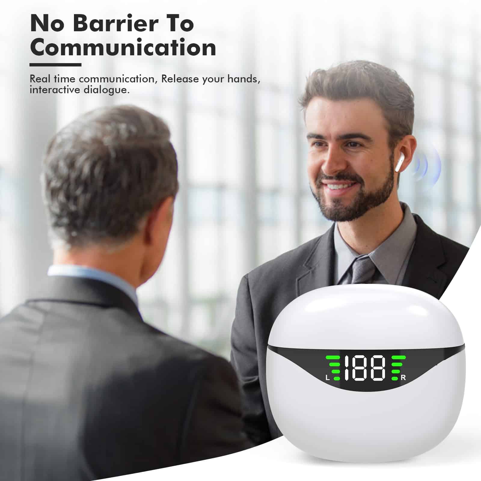 5. Larga duración de la batería: Con una batería incorporada de 30 mAh y una caja de batería de 200 mAh, nuestros auriculares traductores instantáneos tienen una larga duración de batería de hasta 24 horas, para que los puedas usar durante períodos prolongados sin preocuparte por quedarte sin energía