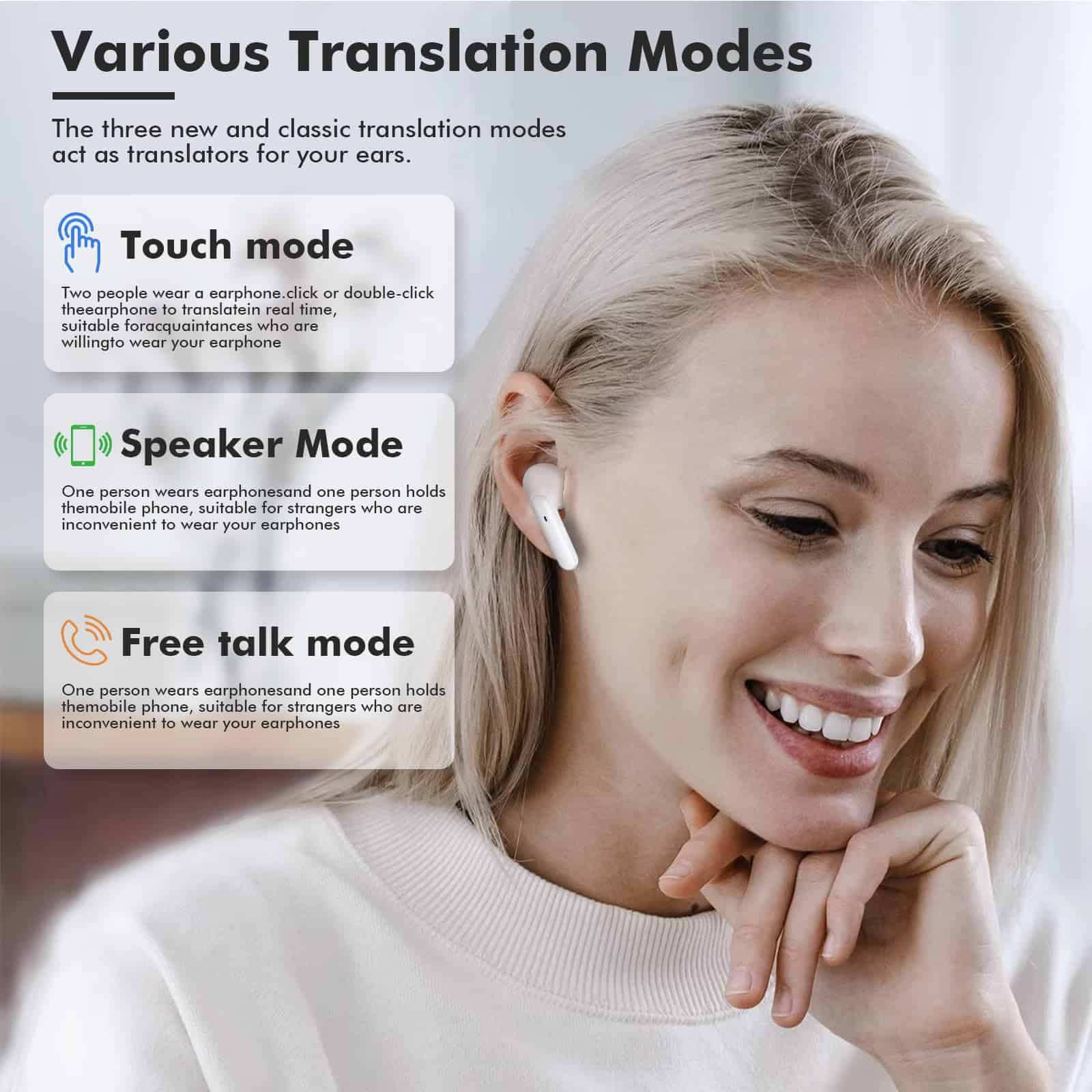 3. Múltiples modos de traducción: Empareja fácilmente los auriculares con nuestra intuitiva aplicación móvil y 3 modos de traducción (Modo táctil/Modo de conversación libre/Modo altavoz) para un control y personalización fluidos de las preferencias de idioma, y podrías usarlos como lo harías con otros auriculares.