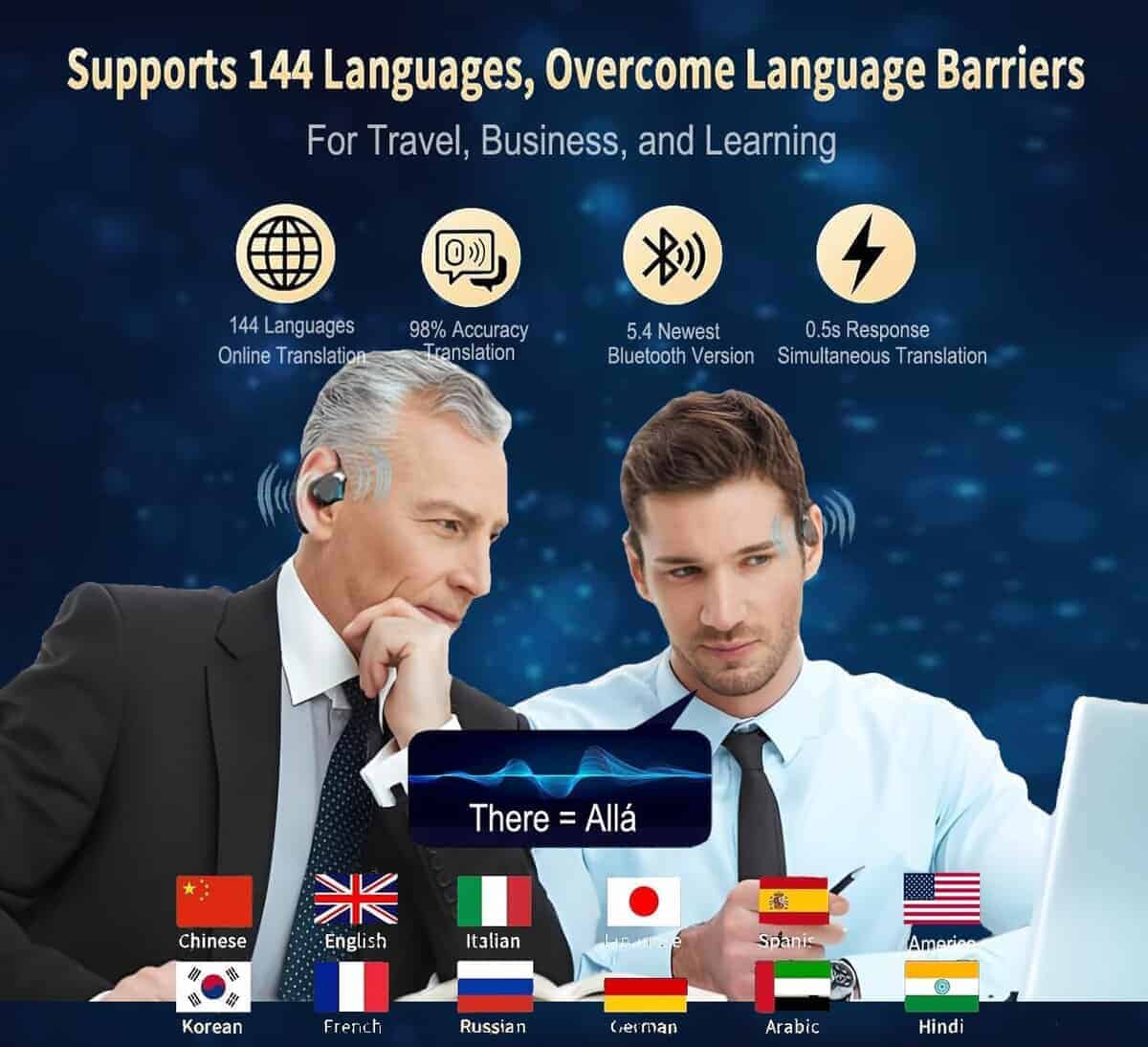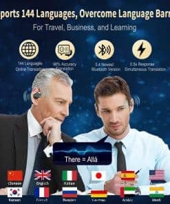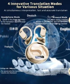 Los auriculares de traducción AI brindan traducción en tiempo real en 144 idiomas (74 idiomas, 70 acentos), incluyendo inglés, chino, japonés, coreano, alemán, francés, etc. Puede traducir entre cualquier par de idiomas y comunicarse sin problemas. La versátil función de 3 en 1 combina traducción, reproducción de música y funciones de llamadas telefónicas en un solo dispositivo, ofreciendo una conveniencia incomparable. La cancelación activa de ruido filtra eficazmente el ruido de fondo, lo que le permite disfrutar de una comunicación clara y música incluso en entornos ruidosos. Los distintos modos de traducción se adaptan a diversas situaciones, como modo silencioso, modo de auriculares, modo de altavoz y modo de dos auriculares para una comunicación clara. Los auriculares de traducción AI ofrecen un diseño elegante y ligero con materiales de alta calidad, garantizando un uso cómodo durante largos periodos. La batería de litio recargable de alto rendimiento brinda hasta 6 horas de tiempo de escucha sin interrupciones, y el estuche de carga rápida incluido asegura que sus auriculares estén siempre listos cuando los necesite.