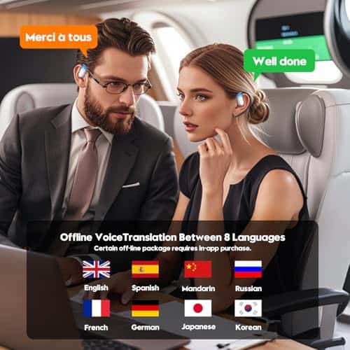3. Funcionalidad 3 en 1 y calidad de sonido HD: Estos auriculares traductores de idiomas ofrecen versatilidad y comodidad para el trabajo y la vida diaria, combinando traducción, reproducción de música y llamadas telefónicas. Los auriculares traductores ofrecen calidad de sonido HD para garantizar un audio claro, independientemente de la ocasión.