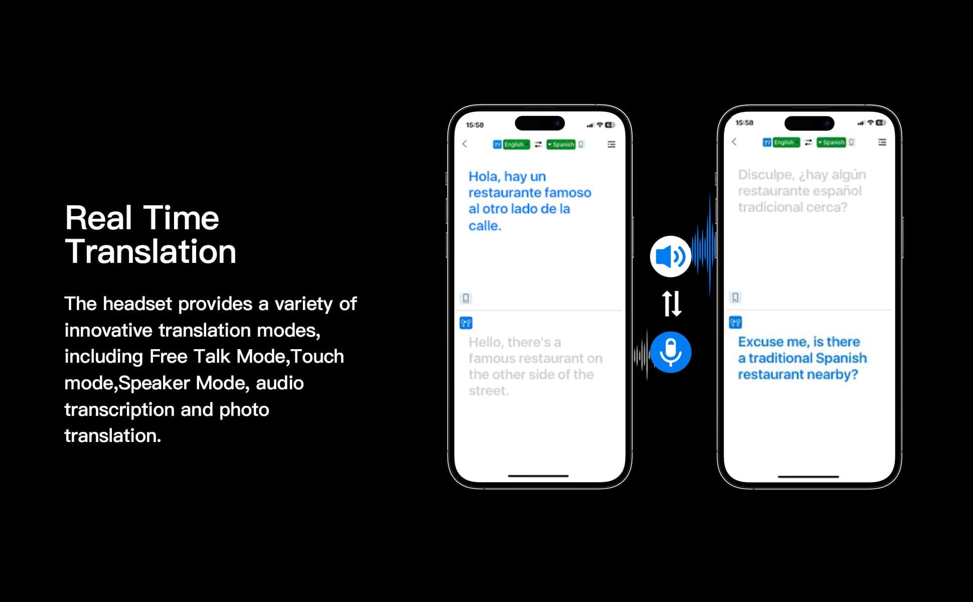 2. Modos de traducción multi-escenario y protección de privacidad: El auricular ofrece una variedad de modos de traducción innovadores, incluyendo modo de conversación libre, modo sin conexión, transcripción de audio y traducción de fotos, garantizando una comunicación clara en diferentes escenarios. El auricular es compatible con la traducción de idiomas sin conexión, lo que protege la privacidad del usuario y evita la latencia de red y el riesgo de fuga de datos.
