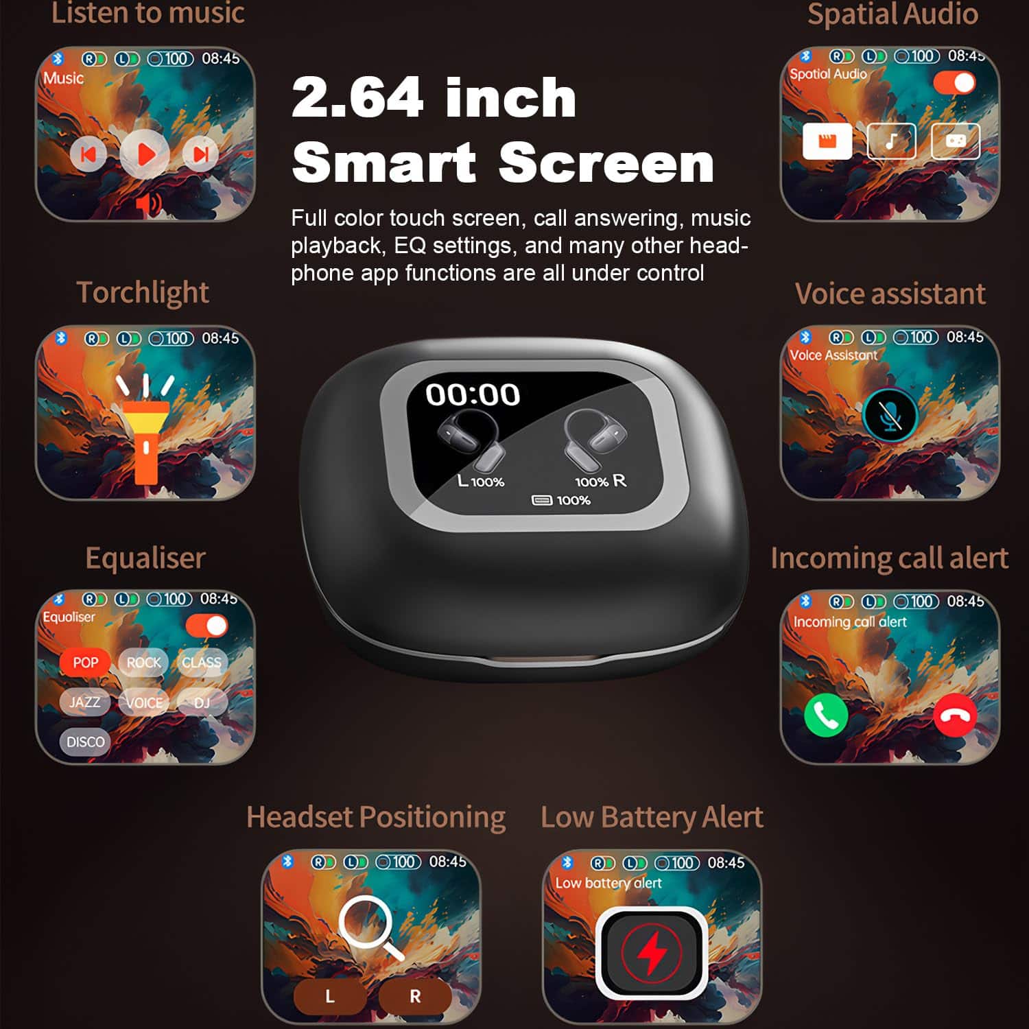 3. Sistema de control táctil inteligente: los auriculares traductores con pantalla táctil gestionan los ajustes a través de la pantalla táctil a color incorporada o la caja de carga. Ajusta el volumen, cambia la música, activa la cancelación de ruido o personaliza fondos de pantalla. Función extra: controla la cámara de tu smartphone de forma remota para mayor comodidad manos libres.