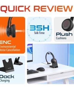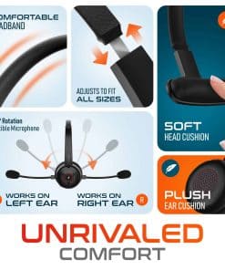Enjoy the perfect fit and comfort for extended wear, with the soft head cushion, and plush ear cushions of our wireless headset with mic for work. The microphone rotates 270 degrees for optimal positioning, ensuring you’re heard clearly. This laptop headset with microphone also has an adjustable headband to accommodate different head sizes for personalized comfort.