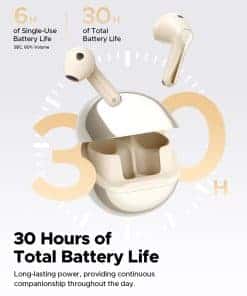 4. Impresionante Duración de la Batería: Disfrute de hasta 6 horas de reproducción con una sola carga, con una duración total de la batería de aproximadamente 30 horas. Condiciones de prueba: Conexión Bluetooth AAC al 60% de volumen, ANC apagado y otras funciones con configuraciones predeterminadas. El modo de juego ofrece una latencia ultra baja de 77ms, asegurando una experiencia sin retrasos cuando se usa con dispositivos Qualcomm Snapdragon Sound.