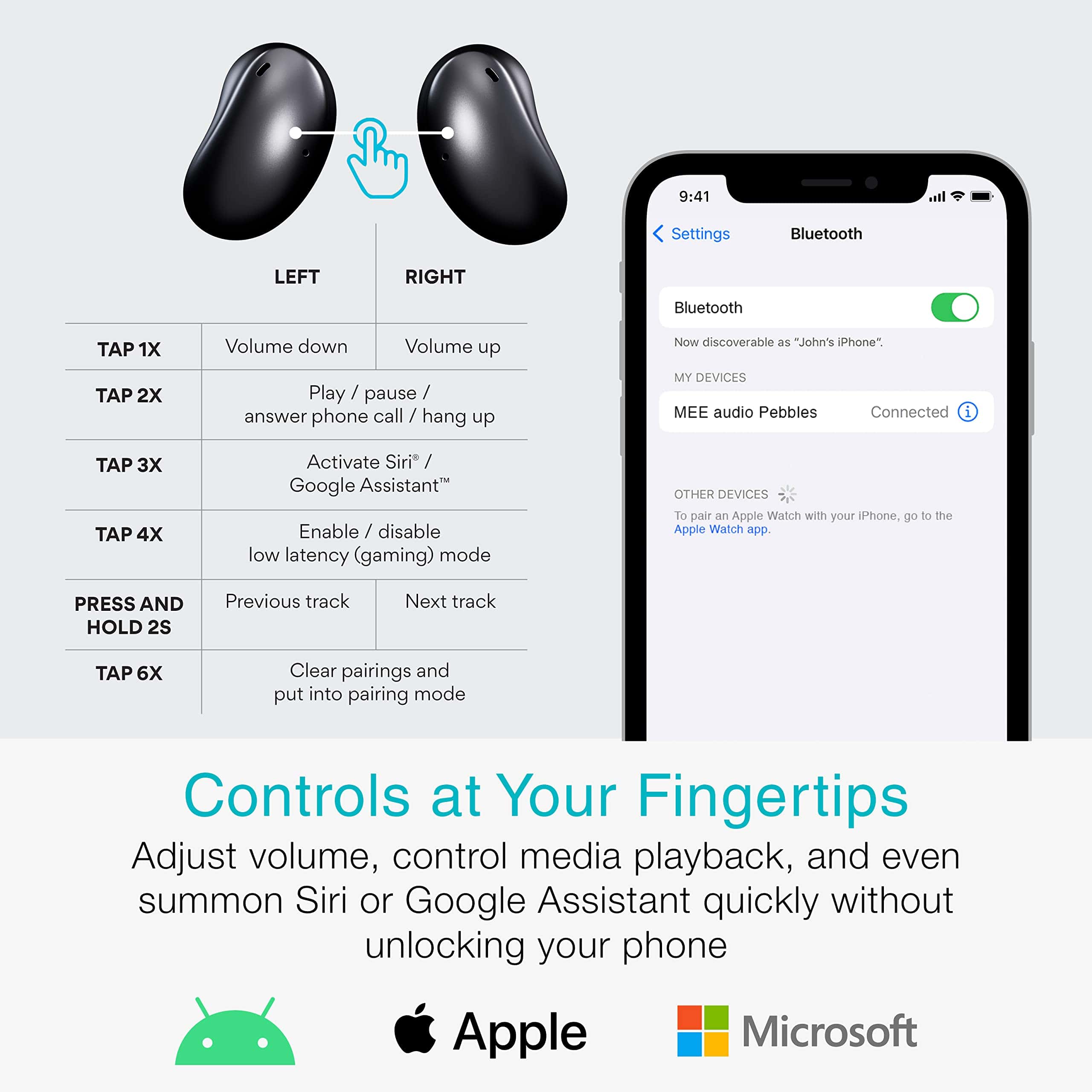 Por último, los Pebbles ofrecen una conectividad Bluetooth avanzada con la tecnología Bluetooth 5.3, que garantiza una conexión estable y sin interrupciones. Con la capacidad de reconexión instantánea con los auriculares izquierdo y derecho de forma independiente, así como el modo de juego de baja latencia que elimina el retraso entre el audio y el video, los Pebbles ofrecen una experiencia superior al jugar o ver tus videos favoritos. Además, con controles táctiles intuitivos que te permiten ajustar el volumen, controlar la reproducción de medios y llamar a tu asistente de voz rápidamente, los Pebbles son simplemente una opción excepcional en todos los aspectos. Disfruta de la libertad y la comodidad de la verdadera tecnología inalámbrica con los auriculares MEE audio Pebbles.