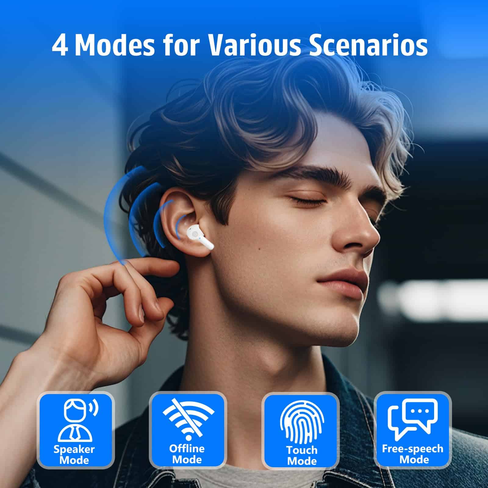 4. Adecuado para una variedad de escenarios: 1. Modo de contacto: dos personas que usan un auricular cada una, simplemente tocan los auriculares para hablar y traducir en tiempo real. 2. Modo de altavoz: utiliza los auriculares inteligentes o usa dos auriculares para tener una breve conversación con cualquiera, por ejemplo, para pedir direcciones o para ordenar comida. 3. Modo de habla libre: cada persona usa un auricular, la comunicación es sin obstáculos, perfecto para conversaciones uno a uno en profundidad.