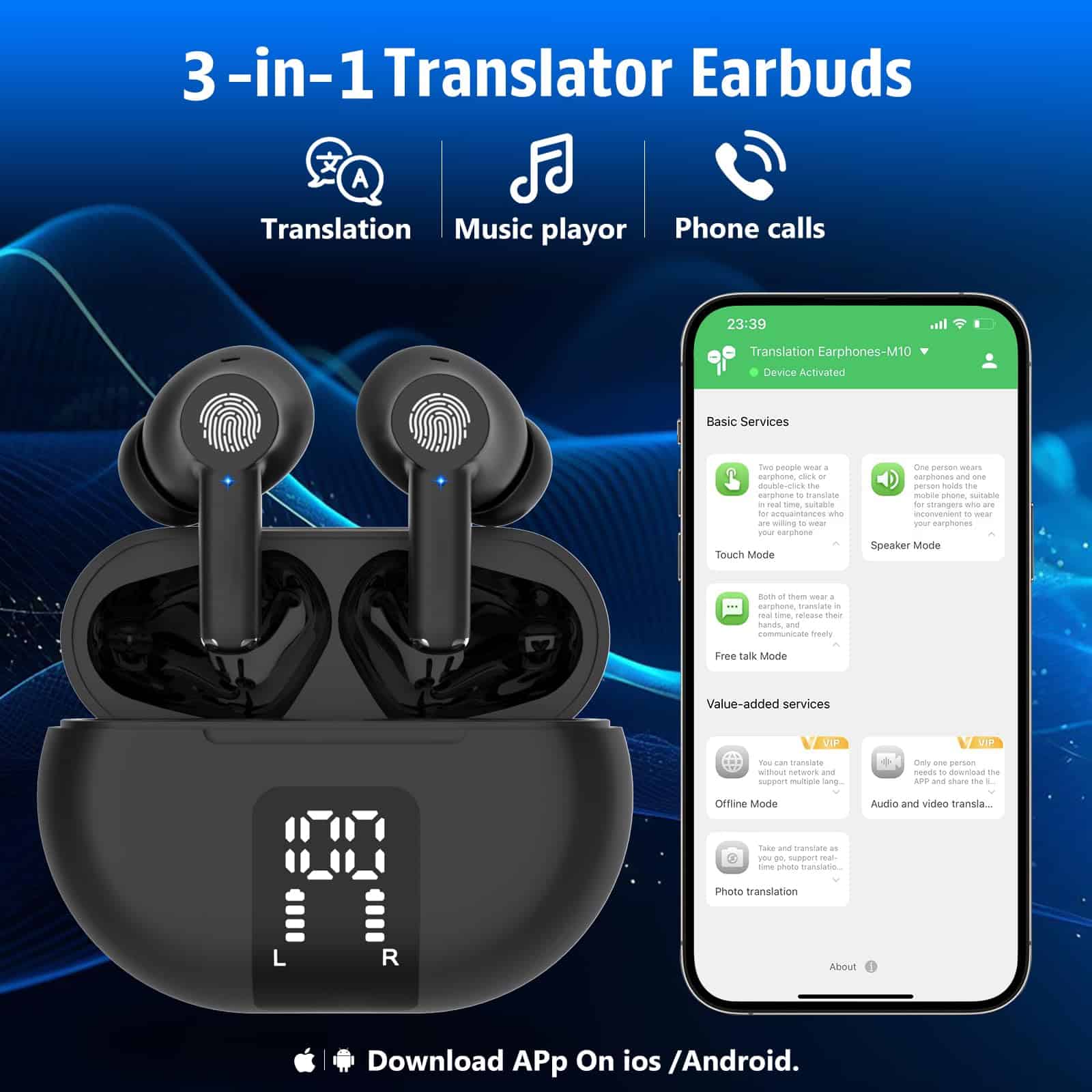 3. 3 EN 1 Y REFRIGERACIÓN DE RUIDO DE ALTA DEFINICIÓN: Combina traducción en tiempo real, reproducción de música y funciones de llamada. Con el sistema de control táctil, puedes iniciar fácilmente una conversación con solo tocar los auriculares, eliminando las barreras de comunicación al instante. El M10 cuenta con una membrana vibrante de 10 mm y cancelación de ruido HD. Ya sea que estés hablando por teléfono, escuchando música o interpretando, el M10 ofrece una calidad de sonido cristalino y de alta definición.