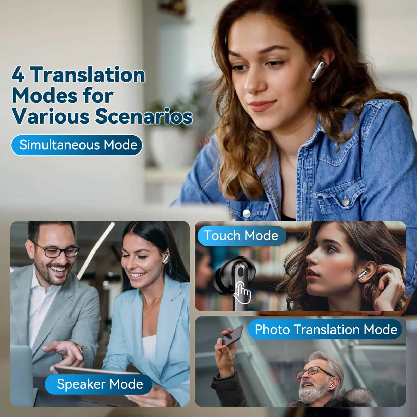 3. Varios Modos de Traducción Estos auriculares de traducción bluetooth ofrecen cuatro modos de traducción diferentes para ayudarte a adaptarte a una amplia gama de escenarios de comunicación y satisfacer diversas necesidades. El modo táctil es adecuado para traducciones rápidas y discretas; el modo altavoz es perfecto para discusiones en grupo y presentaciones; el modo simultáneo permite una conversación natural y continua y el modo de traducción de fotos es perfecto para el aprendizaje diario.