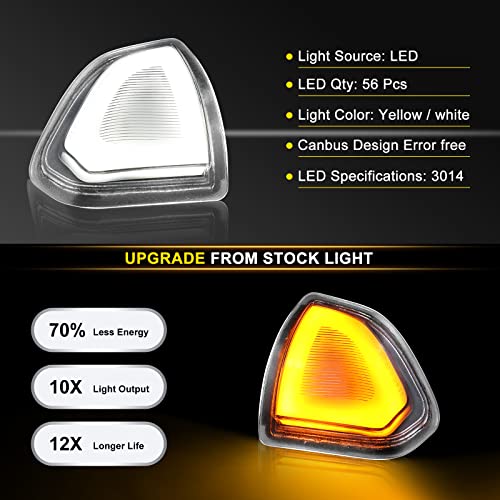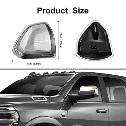 Luz de giro del espejo lateral Ram parpadeante intermitente para Dodge Ram 1500 2500 3500 4500 5500 Las luces de señal de giro del espejo Ram funcionan de la siguiente manera: Señal (sin luz de funcionamiento): Luz ámbar intermitente Luz de funcionamiento encendida y señal activada: Luz blanca sólida se apaga durante la señal y ámbar Detalles del producto: Impermeable: IP65 Color Led: Ámbar Cantidad de Led: 28 chips de alta calidad Color de la lente: Ahumado Voltaje: 12v Potencia: 5w Modo de operación: Luz intermitente ámbar Más brillante: aproximadamente 5 veces más brillante que el bombillo OEM La luz del espejo lateral de los números de parte OEM: 68302828AA y 68202829AA y 68087235AA y 68087234AA y 68067759AA y 68067758AA y 68460762AA y 68460763AA Hecho de carcasa de plástico ABS de alta calidad y lente de PC, con protección impermeable IP65 y buena selladura, la lámpara puede funcionar normalmente bajo condiciones climáticas severas como lluvia, tormenta, niebla y nieve. Plug and play, no es necesario perforar ni modificar. La instalación es muy fácil, toma unos minutos completarla. Retire la antigua luz de señal de giro del espejo retrovisor, luego enchufe nuestra luz de señal de giro lateral del espejo retrovisor LED actualizada en el enchufe de fábrica original. Compatibilidad: Compatible con Dodge Ram 1500 2500 3500 2010 Compatible con Ram 1500 2011-2022 Compatible con Ram 1500 Classic 2019-2022 Compatible con Ram 2500 4500 5500 2011-2018 Compatible con Ram 3500 2011-2019, 2021-2022 Lo que incluye el paquete: Un juego de luces de señal de giro lateral del espejo (lado del conductor y del pasajero)