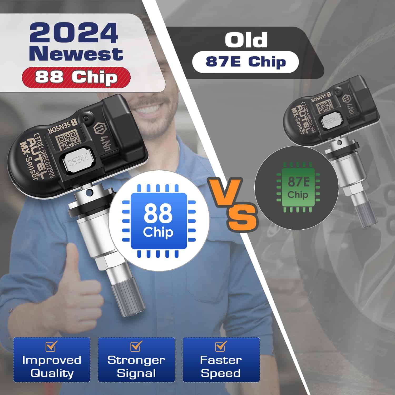 3. VERSIÓN DE CHIP MÁS NUEVA DE 2024 El TPMS MX-Sensor de Autel tiene el nuevo chip 88, mejorado del antiguo chip de sensor 87E, que dará la señal más fuerte en la programación inalámbrica de manera más rápida, y la comunicación es más estable y segura. Hasta 16 sensores se pueden programar en una sesión con las últimas herramientas TPMS de AUTEL. AUTEL MX-Sensor es 100% clonable. No se requiere re-aprendizaje cuando el MX-Sensor está clonado con el ID de sensor original y colocado en la misma posición.