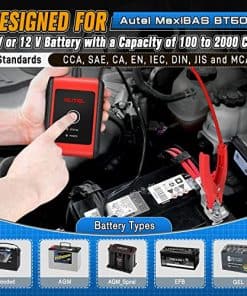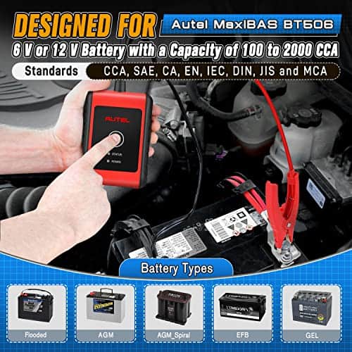 3. Aplicación más amplia: ¿Funcionará en mi batería (pregunta más frecuente), el probador de batería Autel BT506 está diseñado a medida para la mayoría de las baterías de 6V o 12V con una capacidad de 100 a 2000 CCA, como baterías regulares de inundación, AGM, AGM en espiral, EFB, baterías GEL y sistemas de arranque y carga de 12V y 24V y sigue estrictamente las normas de calificación de baterías: CCA, CA, SAE, EN, IEC, DIN, JIS y MCA.