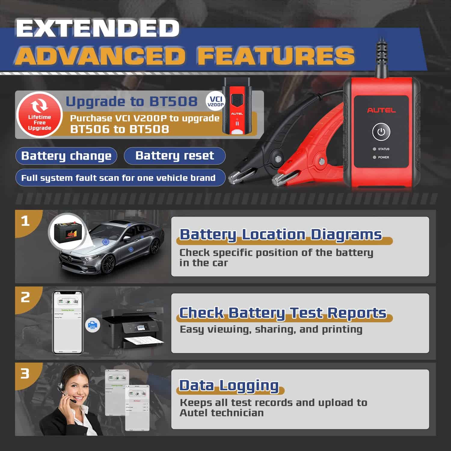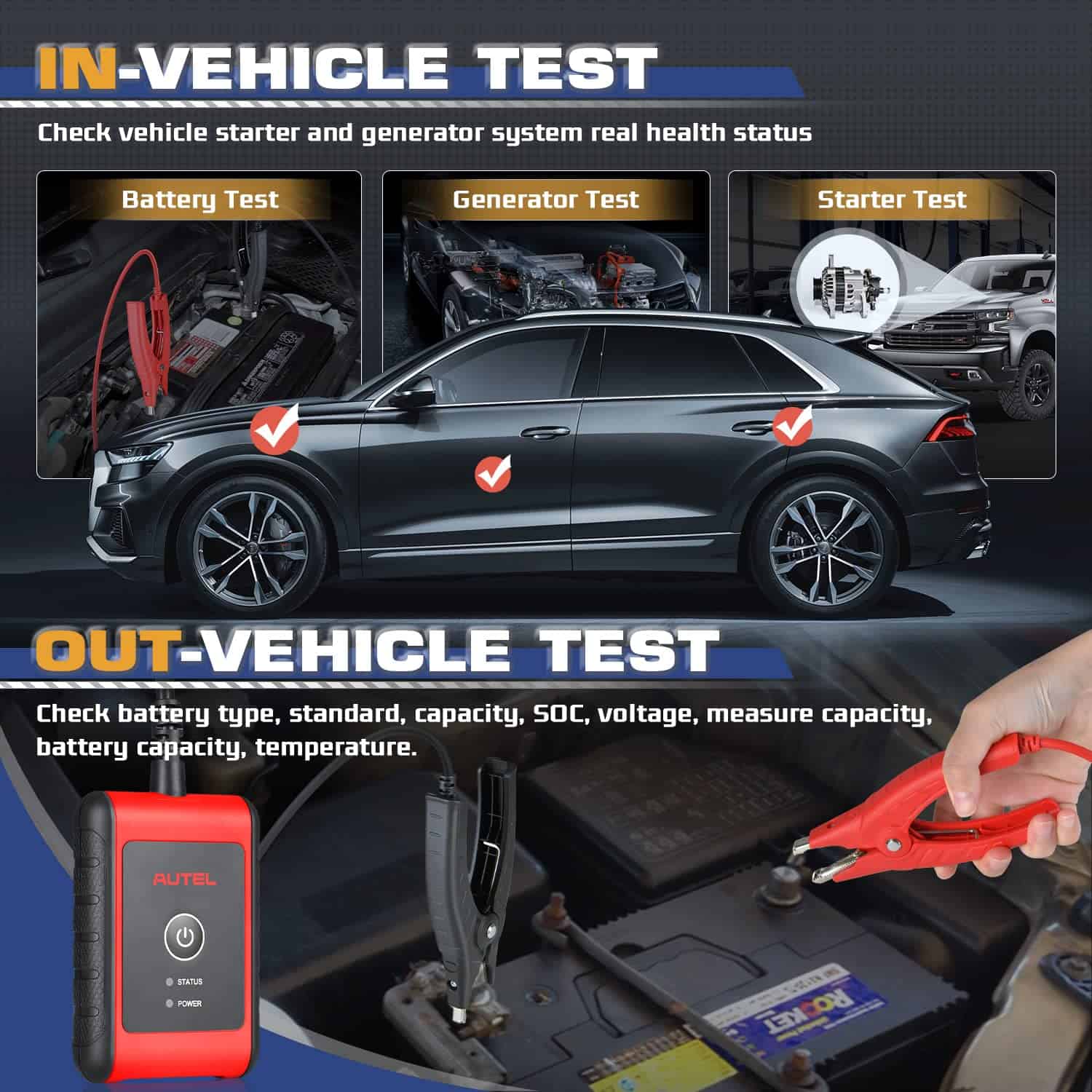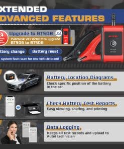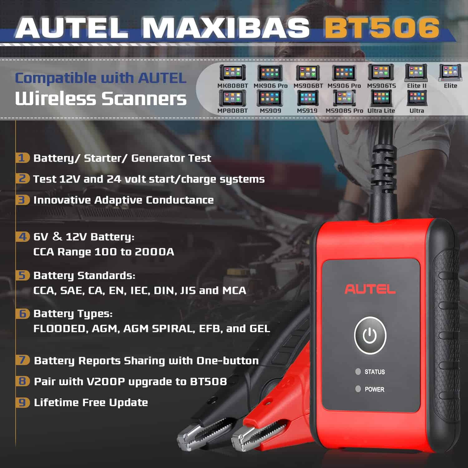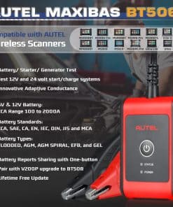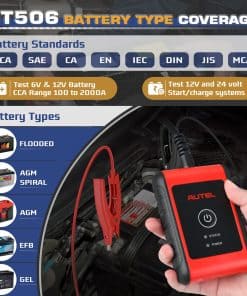 Autel BT506 es una herramienta de escaneo de batería que utiliza la última tecnología llamada conductancia adaptativa para probar las celdas de la batería y realizar pruebas energéticas precisas para mecánicos profesionales y talleres de baterías. Con esta característica, BT506 puede identificar rápidamente la capacidad de arranque en frío de la batería, probar baterías de baja capacidad y descargar baterías, mejorar la tasa de detección de baterías anormales, reducir al mínimo la tasa de error de juicio y reducir la cantidad de reevaluaciones. Además, Autel BT506 puede trabajar con el 99% de los escáneres inalámbricos de Autel, como MK808BT PRO, MK808TS, MK808S-TS, MX808S-TS, MP808BT PRO, MP808TS, MP808S-TS, MS906BT, MS906TS, MX900TS, MP900-TS, MS906 Pro, MS906 Pro-TS, MK906 Pro-TS, MS908S PRO II, MK908 II, MK908 PRO II, Elite II PRO, MS909, MS919, Ultra, Ultra Lite, MS909EV, Ultra EV, etc. Nota: BT506 no puede trabajar con escáneres cableados de Autel y herramientas de programación de llaves. Además, BT506 viene con más funciones adicionales a un precio constante para técnicos, talleres y plantas, como comprobar informes de prueba de baterías con fácil visualización, compartir e imprimir, localizar diagramas de ubicación de baterías con precisión, grabar todos los registros de prueba y cargar el registro de datos. Software de actualización gratuita de por vida significa que no es necesario pagar otros costos por actualizaciones de software. BT506 viene con 1 año de garantía y política de devolución y reemplazo de 30 días sin motivo. Si tienes alguna pregunta, no dudes en contactarnos a través de: auteldirect @ outlook. com.