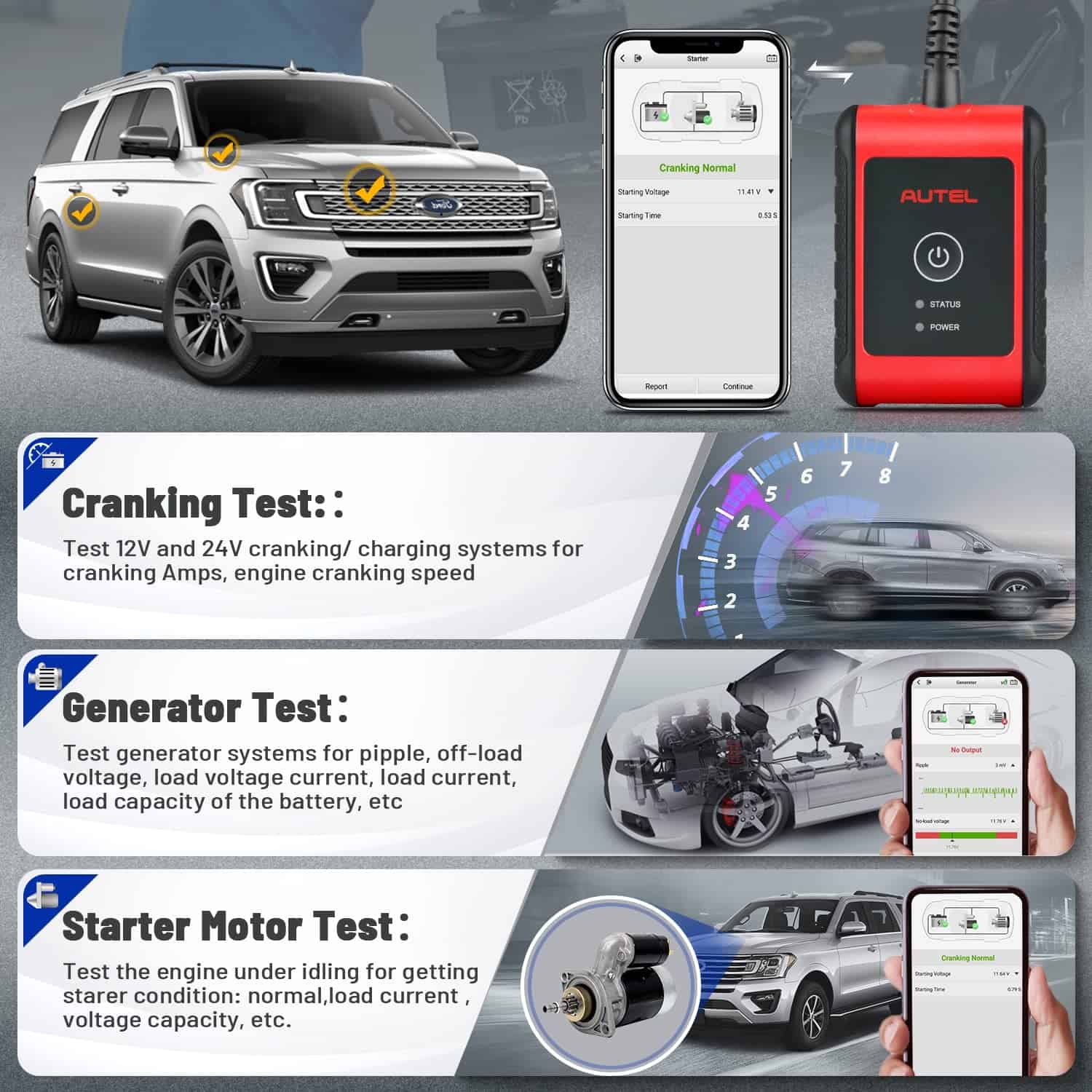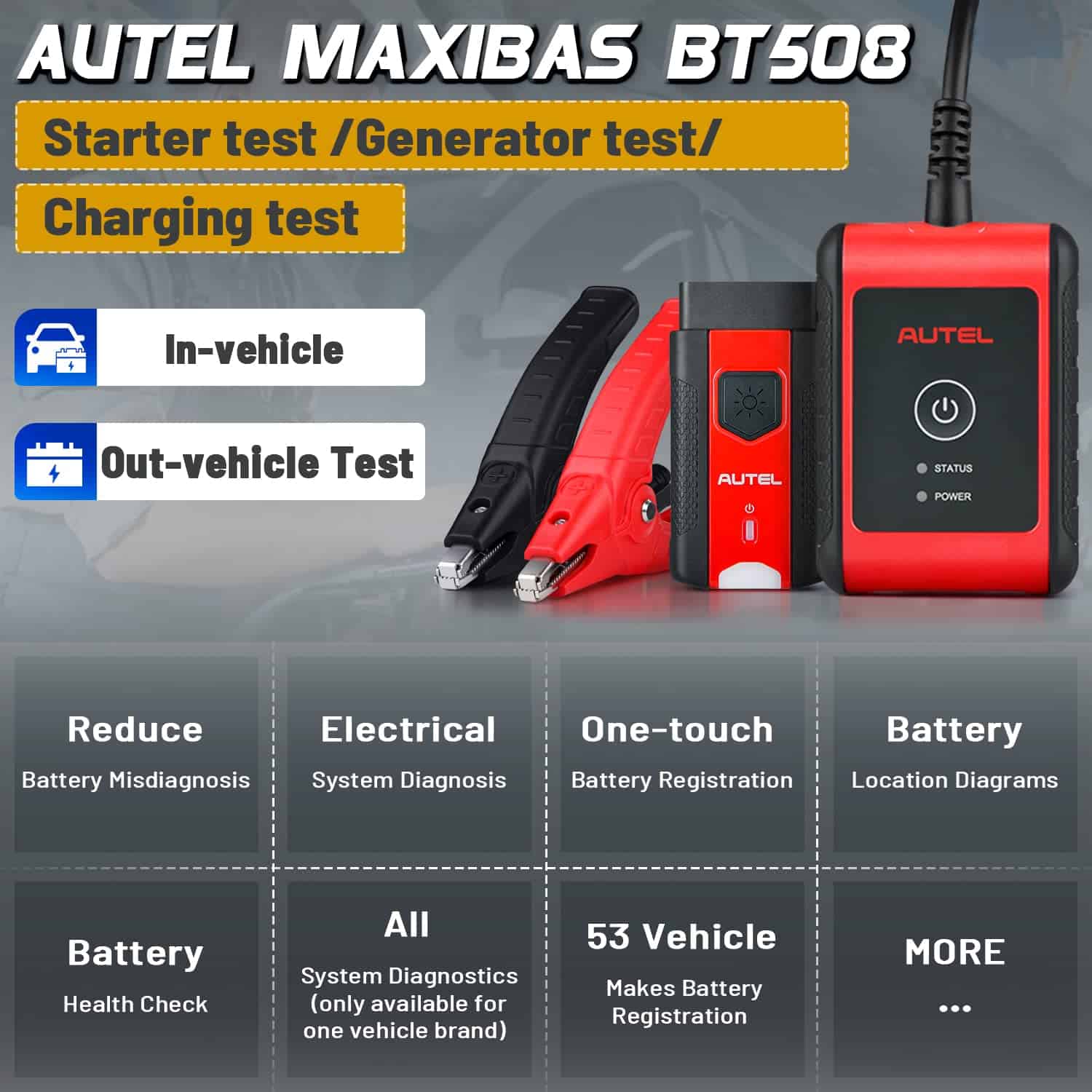 Autel MaxiBAS BT508 es el probador de batería más reciente para automóviles, una actualización del BT506 que cubre todas sus funciones y agrega características avanzadas para un diagnóstico preciso. Con algoritmo de conductancia adaptativa, el probador de batería BT508 puede realizar pruebas de arranque y generador de manera más rápida y precisa. La tecnología de conductancia adaptativa identifica la capacidad de arranque en frío de la batería, detecta baterías de baja capacidad, reduce la tasa de error y la tasa de retrabajo, y ofrece diagnóstico de todos los sistemas para una mayor precisión. Compatible con una amplia gama de baterías y normas. Incluye funciones de registro de batería y reseteo de sistemas eléctricos, actualizaciones gratuitas de por vida y reportes de reparación.
