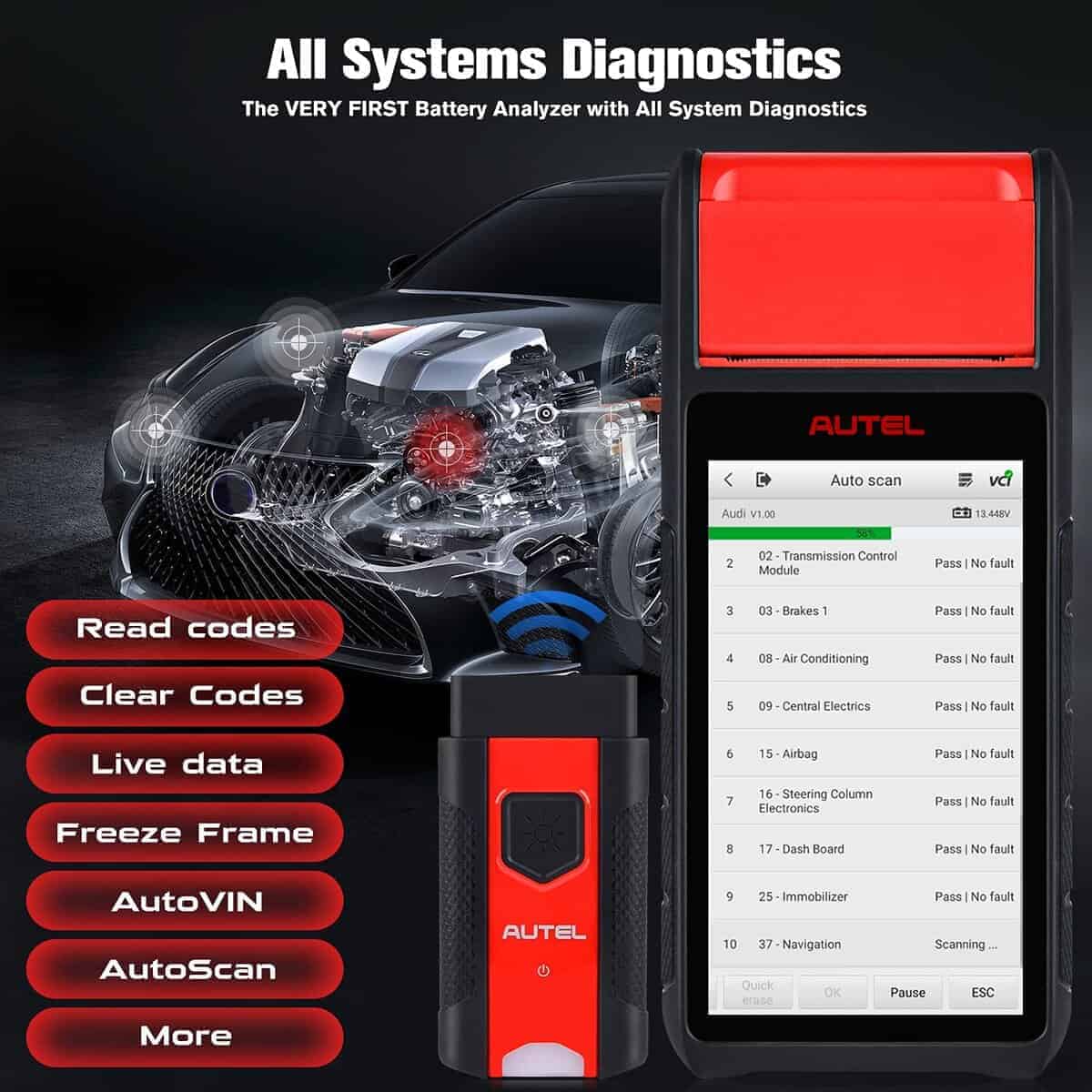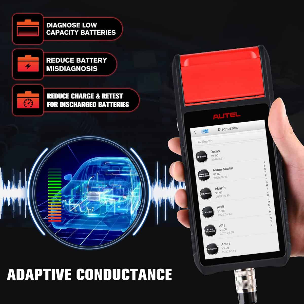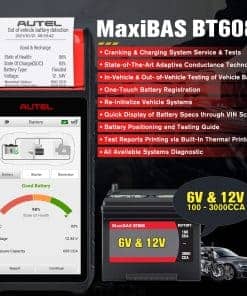 Autel MaxiBAS BT608 es un analizador de baterías profesional para probar baterías de 6 a 12 voltios con 100-3000 CCA, que puede probar tanto dentro como fuera del vehículo. La prueba dentro del vehículo se utiliza para probar baterías instaladas en el vehículo que cubre las pruebas de arranque de batería del generador. La prueba fuera del vehículo se utiliza para probar el estado de las baterías que no están conectadas al vehículo. Admite baterías FLOODEADAS, AGM, AGM SPIRAL, EFB, GEL conforme a los estándares CCA, SAE, CA, EN, EN2, IEC, DIN, JIS, MCA, BCI, GB. La prueba de arranque y carga de la batería MaxiBAS BT608 verifica la salud de la batería para sistemas de vehículos de pasajeros de 12V a 24V, incluyendo pruebas de arranque y carga completas. La prueba de arranque determina si el sistema eléctrico tiene suficiente potencia para arrancar el motor. La prueba de carga puede verificar el estado del sistema de carga, comprobar si la corriente de carga, diodo rectificador y generador funcionan correctamente para evitar daños en la batería debido a la sobrecarga o carga incompleta. Gracias a la tecnología de conductividad adaptativa, Autel MaxiBAS BT608 proporciona la prueba de batería más precisa en milisegundos, detectando con precisión la capacidad de arranque en frío de la batería y la capacidad de reserva. Puede reducir la tasa de error de diagnóstico de la batería al mínimo, mejorar la precisión de la batería, garantizar la detección precisa de baterías defectuosas y sin errores ni diagnósticos repetidos, más rápido para juzgar el estado de la batería en solo 3 segundos. Los resultados de la prueba rápida y precisa se muestran en solo segundos. Soporta diagnóstico de todos los sistemas para todos los sistemas disponibles, como Motor, ABS, SRS, BMS, A/C, Chasis, Grupo Motriz, etc. Viene con tecnología de escaneo automático VIN para identificar fabricante, modelo y año, sobre la que realiza lectura/ borrado de códigos, datos en vivo, datos congelados, etc. Este probador de baterías BT608 admite el escaneo de más de 10,000 vehículos entre EE. UU., Europa y Asia para hacer lo que necesitas.