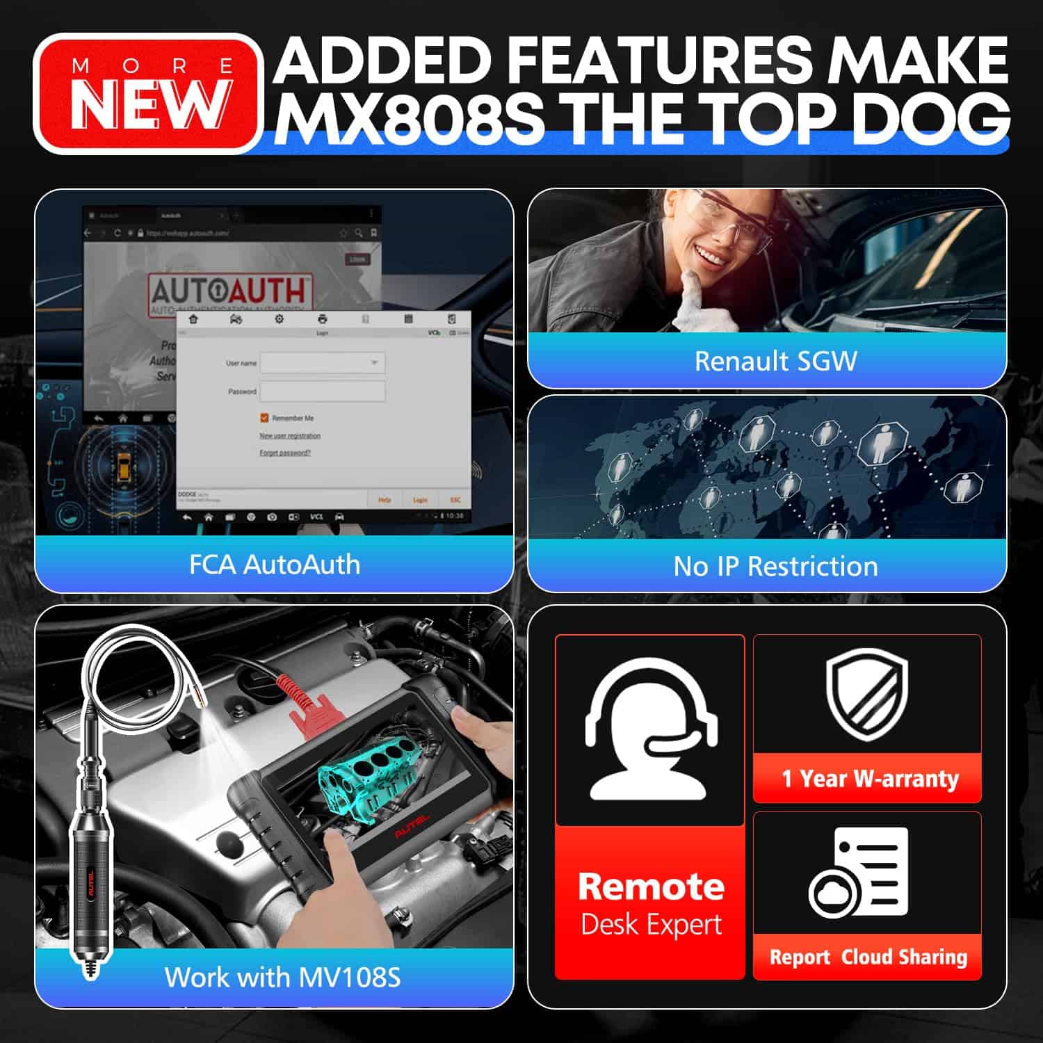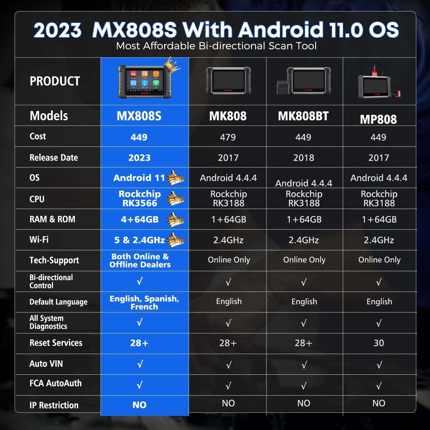 Por favor, lea detenidamente antes de comprar. Ordene el 2024 MX808S más nuevo de las tiendas reales de Autel: ‘Autel Choice’, NO de la tienda ‘The TOOL GUY’, ya que no son productos Autel originales al 100 %. Además, el producto que vendemos es la NUEVA versión 2024 MX808S, mientras que el vendedor ‘The TOOL GUY’ todavía vende la antigua versión de MX808 sin accesorios. 2024 SUPERFAST MX808S, HARDWARE MEJORADO, IGUAL QUE MP808S PERO MENOS COSTO Es hora de que dejes de lado los viejos dispositivos Android lentos como MX808 MK808 MP808 MS906. El 2024 MX808S da un gran salto a un Escáner Bidireccional de nivel superior con Hardware ultra potente, ¡ahorrándote un montón de tiempo! Android 11 más rápido, potente CPU Rockchip RK3566, 4+64GB ampliados para multitareas sin ningún tiempo de carga lento, WiFi Dual 2.4 & 5GHz para actualización inalámbrica sólida, LCD de 7» 1024 600 para lectura extremadamente clara e intuitiva, etc. CONTROL BI-DIRECCIONAL COMPLETO / PRUEBA ACTIVA ¿Qué harías si las ventanas dejaran de funcionar? ¿Ir al concesionario y gastar mucho dinero? La herramienta de control bidireccional MX808S puede realizar las pruebas activas reales que pueden enviar comandos a la ECU del vehículo para hacer funcionar los actuadores, como ABS, ventanas, puertas, solenoides, válvulas, limpiaparabrisas, faros, etc., ayudándote a encontrar rápidamente partes defectuosas y señalar problemas fallidos. ¡Mejor que MaxiCOM MK808S/MK808Z, MEJOR SOPORTE TÉCNICO EN EE. UU.! Autel MaxiCheck MX808S tiene todas las funciones de MaxiCOM MK808S/MK808Z, como bidireccional, 28+ Reset, Diagnóstico OE completo, FCA AutoAuth, etc. Más importante aún, como el Modelo US de MK808S MK808 MK808Z, MX808S tiene más características de bonificación: Disfruta del mejor Soporte Técnico tanto en tiendas en línea y fuera de línea, garantía dual posventa. Soporte para 3 idiomas predeterminados (Inglés Francés Español) sin restricción de IP, puedes cambiarlos directamente. 28+ SERVICIOS, IGUAL QUE MK808BT/MK808S/MK808Z Como uno de los escáneres de diagnóstico más versátiles, Autel MaxiCheck MX808S es la opción más ideal para talleres de reparación y mecánicos, que pueden resolver el 99 % de las mantenimientos de nivel de fábrica de más de 150+ Fabricantes, incluyendo Sangrado ABS, Restablecimiento de Aceite, Codificación de Inyectores, Reinicio EPB, SAS, Regeneración de DPF, Registro de Batería, Reinicio de Acelerador, IMMO Keys, etc. Los servicios NO funcionan en todos los coches. DIAGNÓSTICO DE SISTEMAS DE NIVEL OE, VALE CADA CENTAVO Autel MaxiCheck MX808S funciona bien en más de 80 marcas y modelos de automóviles en todo el mundo (1996 y posteriores), capaz de Leer/ Borrar códigos, Ver Datos en Vivo y recuperar información de ECUs para todos los sistemas disponibles (Motor, ABS, SRS, Trans, EPB, Chasis, Dirección, TPMS, etc.) basado en protocolos compatibles. Al mismo tiempo, los informes de diagnóstico detallados con posibles soluciones pueden revelar la naturaleza exacta del problema para ayudarte a planificar el presupuesto para reparaciones. ¡SIEMPRE ACTUALIZADO! ¡PARA 150+ MARCAS! Como una marca conocida en la industria del diagnóstico, Autel continúa liderando a nivel global en cobertura de coches con la velocidad más rápida para nuevos coches, superando a los competidores de 1-2 años. Series de coches internacionales hasta 2023, 2024, como BBA, GM, Toyota, Nissan, Honda, etc. El escáner MX808S soporta todos los coches OBD2, cubriendo más de 10,000 vehículos en todo el mundo para realizar diagnósticos completos y 28+ servicios. Además, MX808S aplica inglés/francés/español como idiomas predeterminados. NUEVA GESTIÓN DE INFORMES EN LA NUBE DE AUTEL 2024 Autel scanner MX808S añade recientemente la Gestión de Informes en la Nube: Gestión de Dispositivos/ Gestión de Informes. Gracias a esta función, puedes subir datos sin pérdida y compartir informes de diagnóstico a la Nube de Autel con los clientes en cualquier momento a través de Código QR/ correo electrónico/ mensaje de texto directamente, lo que mejora enormemente tu eficiencia en el trabajo. Además, al cargar informes de diagnóstico a la Nube para liberar el almacenamiento de la tableta, tu escáner puede funcionar aún más rápido. ACTUALIZACIONES GRATUITAS DE 1 AÑO Y SOPORTE TÉCNICO DUAL Como tienda oficial de Autel, garantizamos que nuestro escáner de diagnóstico automático MX808S es 100% Autel Original para el mercado estadounidense. Al mismo tiempo, viene con 1 año de actualizaciones gratuitas (una vez que expire el período gratuito de 1 año, aún puedes usar el software actualizado en tu coche).