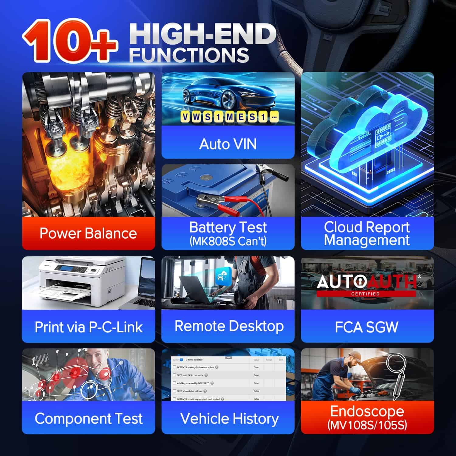 4. 2025 Nuevas Funciones de Alta Gama: FCA SGW + Nube Autel Comparado con otras marcas que no soportan funciones FCA, el escáner OBDII versátil Autel MK808BT PRO puede eludir fácilmente el FCA SGW, no necesita adaptador adicional 12+8. MK808BTPRO puede llevar a cabo un escaneo y diagnóstico de sistema completo en 2018+ Jeep/Fiat/Chrysler/Dodge/Ram. Además, también le permite cargar datos e informes de diagnóstico en el servidor en la nube de Autel, compartir informes con los clientes a través de correos electrónicos/Mensajes/ Código QR. Libera fácilmente tu espacio de almacenamiento y reduce retrasos y desfases en la operación.