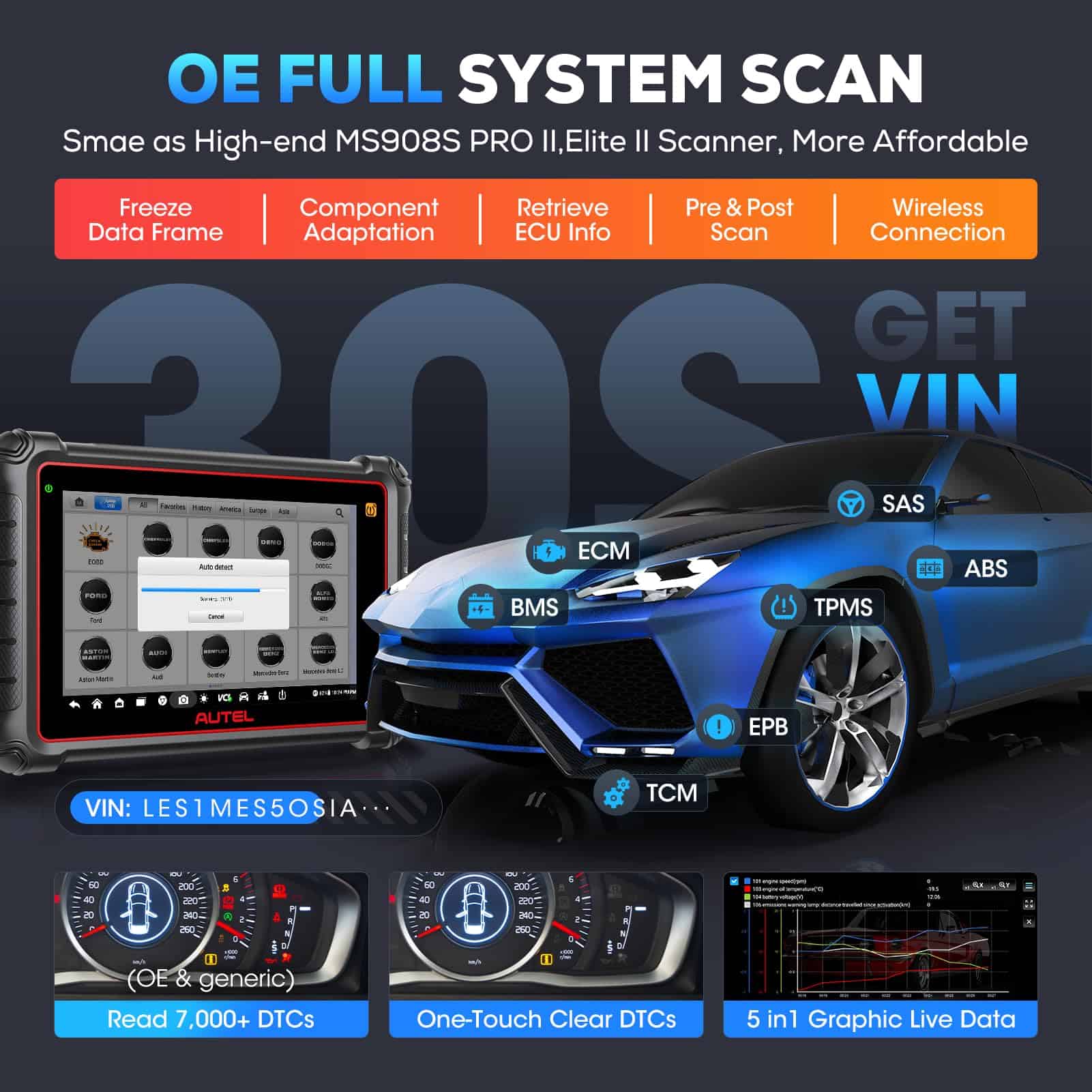 5. SISTEMA COMPLETO OE Y ESCANEADO AUTOMÁTICO 2.0 El Escáner Autel MK900-TS realiza diagnósticos a nivel OE de todos los sistemas incluyendo ECM, TCM, PCM, ABS, SRS, BCM, sistema de Aire Acondicionado, BMS, etc. para leer y borrar códigos DTC, ver datos en tiempo real, fotograma congelado, realizar pruebas activas y recuperar información de la ECU. MK900TS cuenta con 3 formas de diagnóstico en segundos: AutoVIN y Escaneo VIN/Placa. En comparación con MS906-TS/MP808S-TS/MK808-TS/MX808S-TS, el Escaneo Automático 2.0 mejora la eficiencia de escaneo 3 veces más rápido y el tiempo de escaneo es menos tiempo consumidor para un solo sistema.