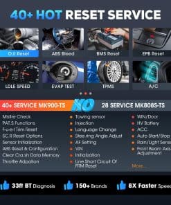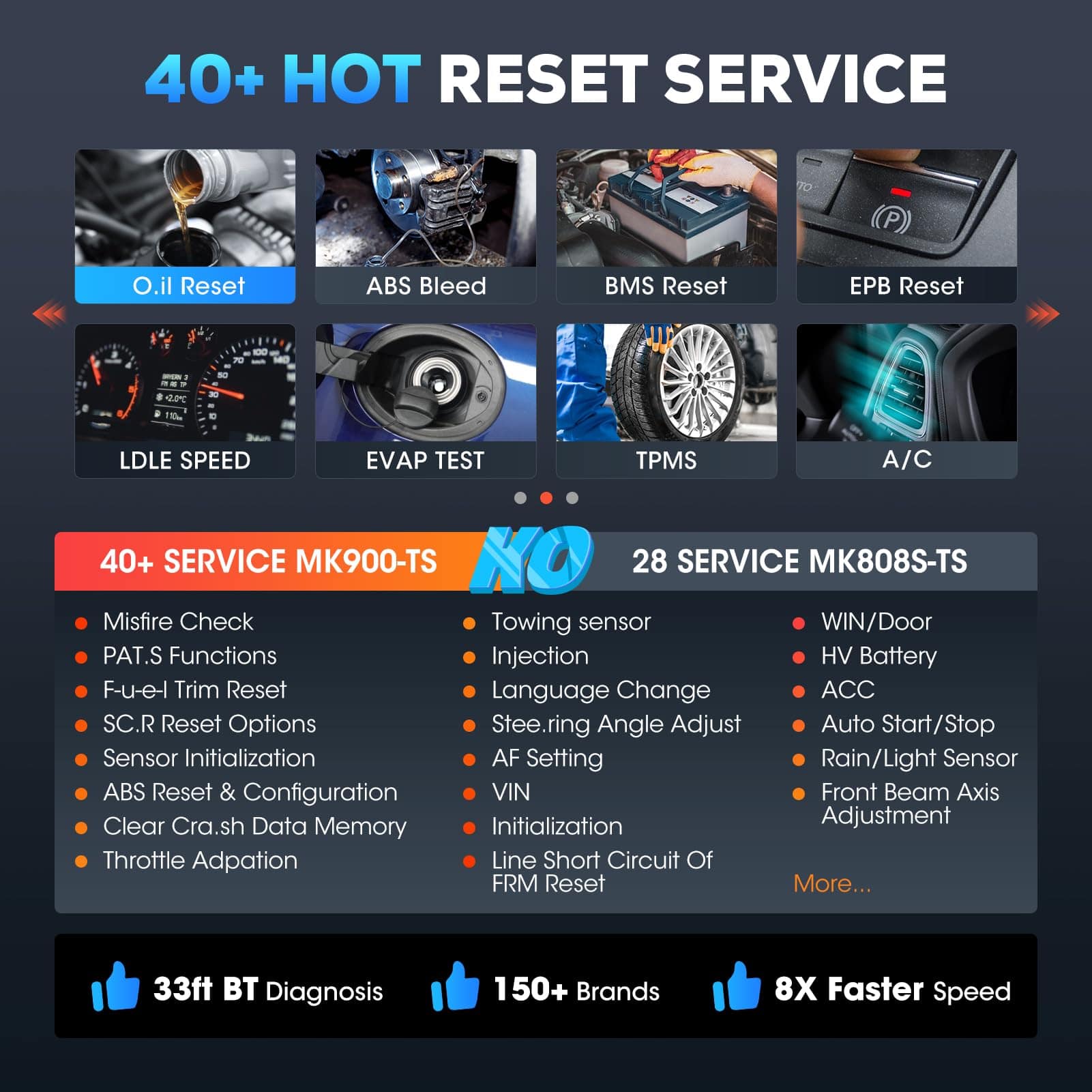 4. 40+ SERVICIOS, COBERTURA DEL 99%. De menos de 28 a 40+ servicios masivos, qué grandes saltos ha dado el Autel MK900-TS. El escáner de autos Autel MaxiCOM MK900TS ofrece 40+ servicios para 10,000 vehículos, como TPMS, Reinicio de Aceite, EPB, BMS, SRS, Sangrado ABS, SAS, Codificación de Inyectores, Adaptación Trans, etc. También agrega servicios avanzados adicionales que no son compatibles con MK808BT PRO MX808S: como Balance de Potencia del Cilindro, Aprendizaje VG.T, Velocidad & PT.O, Aprendizaje del Embrague, Aprendizaje A/T. Nota: Las funciones NO funcionan en todos los vehículos.
