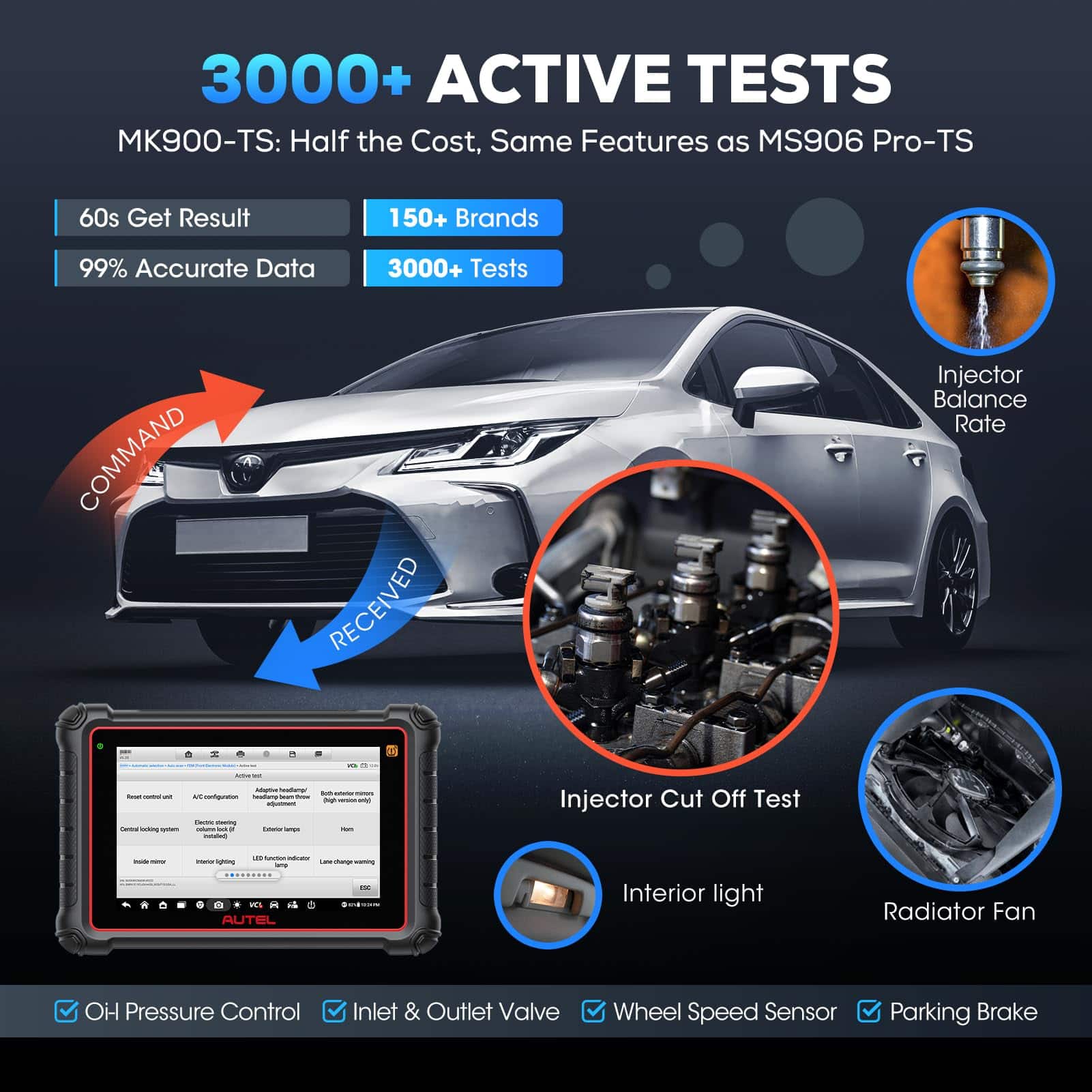 3. DE 50 A 3000+ PRUEBAS BIDIRECCIONALES. ¡Adiós a los escáneres desactualizados que solo tienen 50+ pruebas activas! Autel MK900-TS con 3000+ Pruebas Activas completas puede controlar varios subsistemas, partes y componentes como bombas de combustible, válvulas, limpiaparabrisas, ventanas, puertas, techos solares, faros, etc para realizar pruebas activas para verificar su funcionalidad. Como Prueba de Zumbido del Inyector, Activación del Compresor de Aire Acondicionado, etc. NOTA: Por favor enviar VIN (17 dígitos) para verificar la compatibilidad.