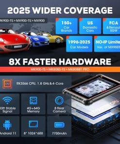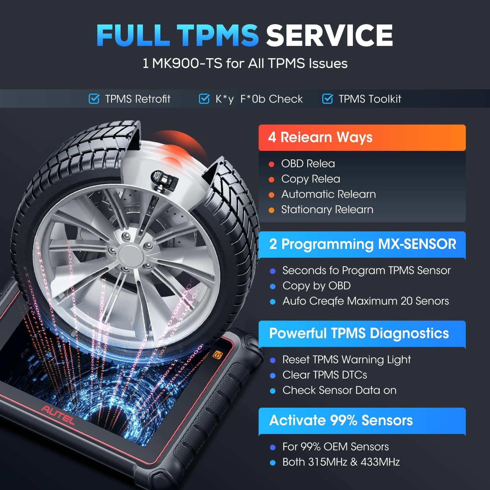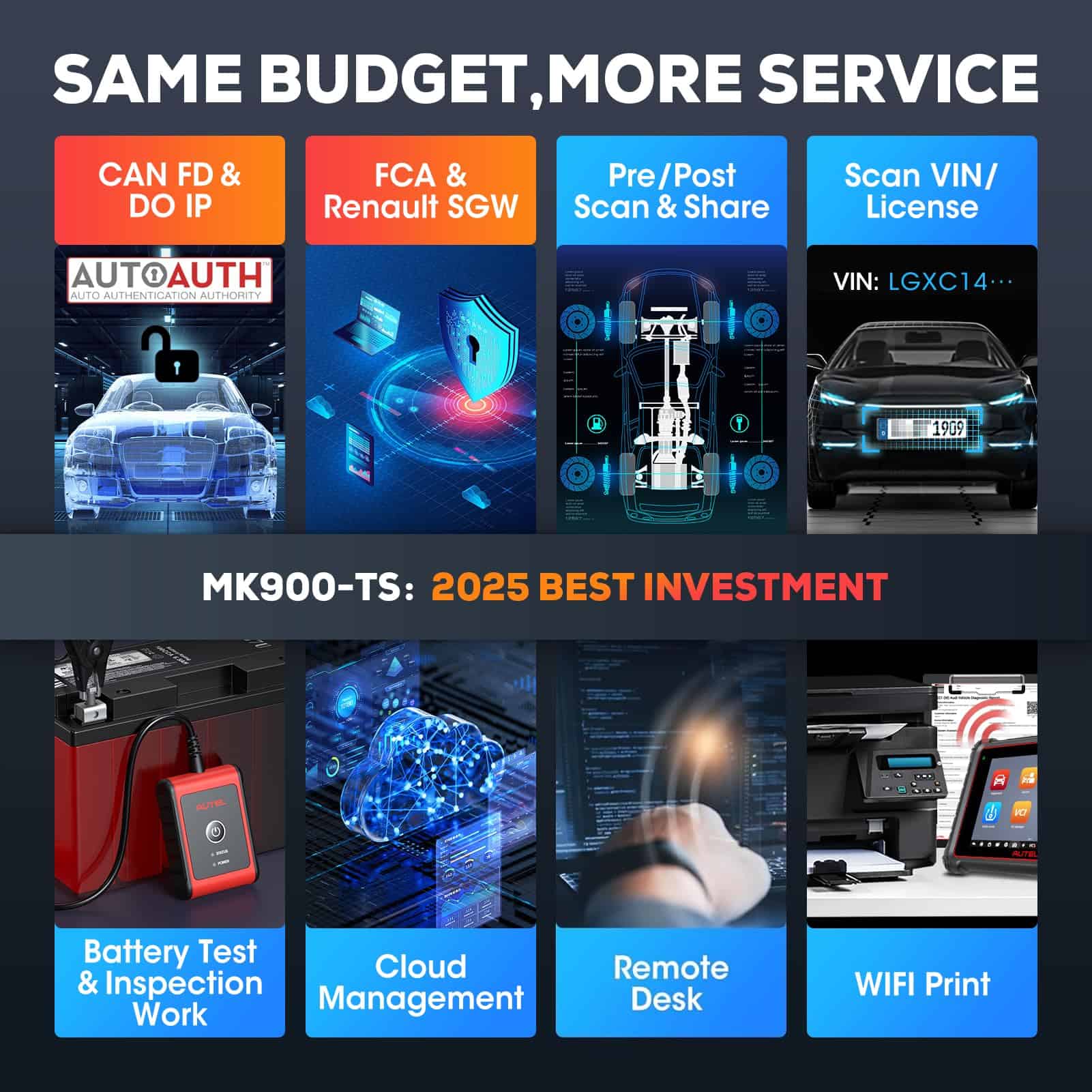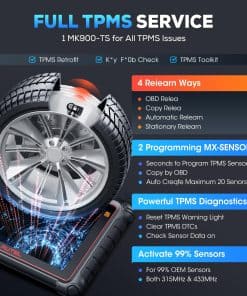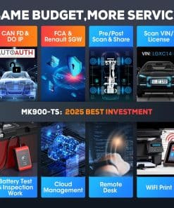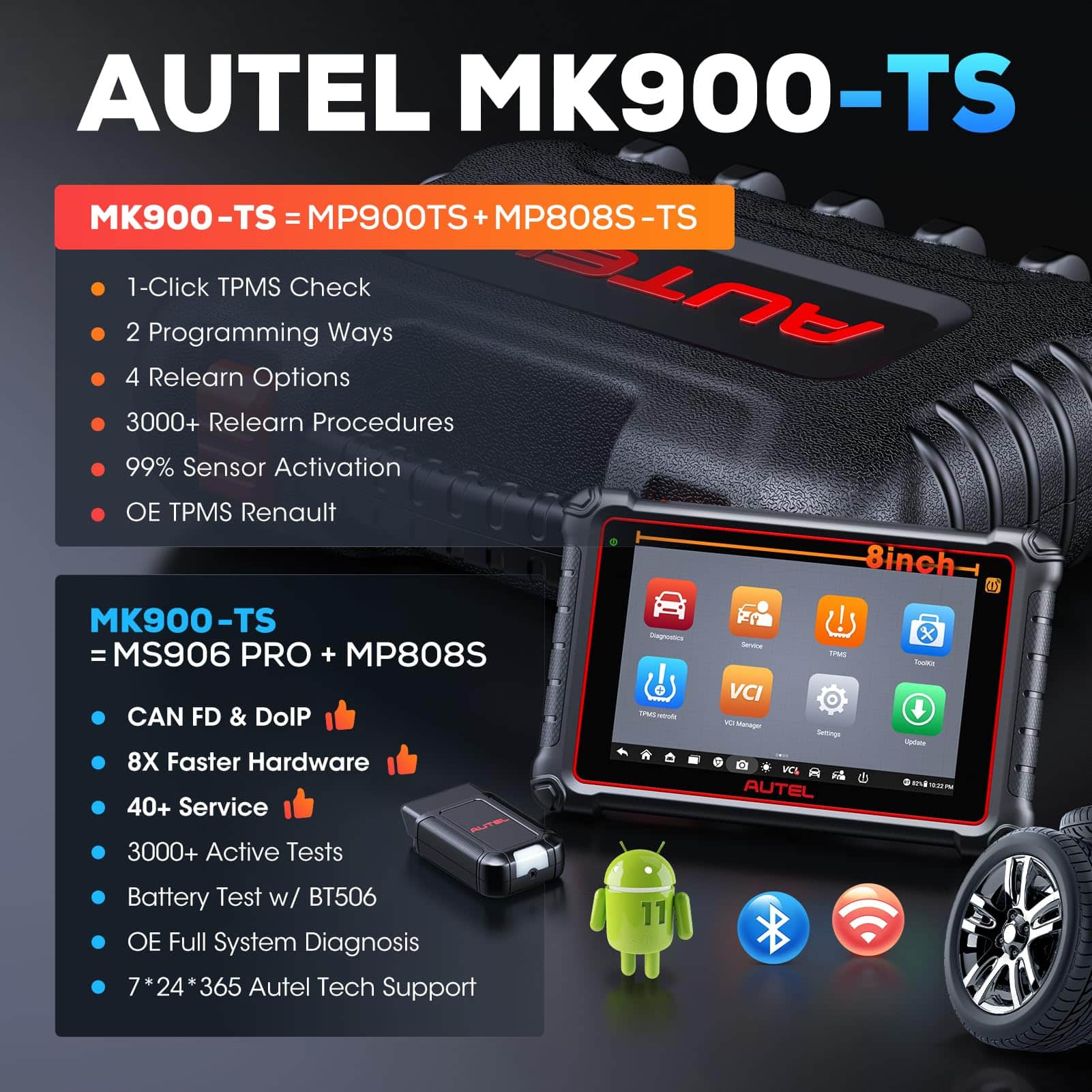 1. 2025 ALL-IN-1 MK900-TS, UP OF MS906TS MK808S-TS Combinado de TPMS y diagnósticos a nivel de fábrica OE, el Autel MK900-TS puede reemplazar fácilmente al MS906TS/MK808S-TS. TPMS completo como MS906 PRO-TS Bidireccional y 3000+ Pruebas como MS906PRO 40+ Servicios como la serie Maxisys Diagnóstico completo como Sna.p-on. Nuevas características mejoradas: CAN FD&DOIP, FCA&Renault SGW, Escaneo Pre y Post, Escaneo VIN/Licencia, etc; Hardware 5 veces más rápido: Android 11, 4+64GB, Pantalla de 8 pulgadas 1280 800, WiFi 5G y 2.4G, Total 10 veces más suave que el escáner tradicional.