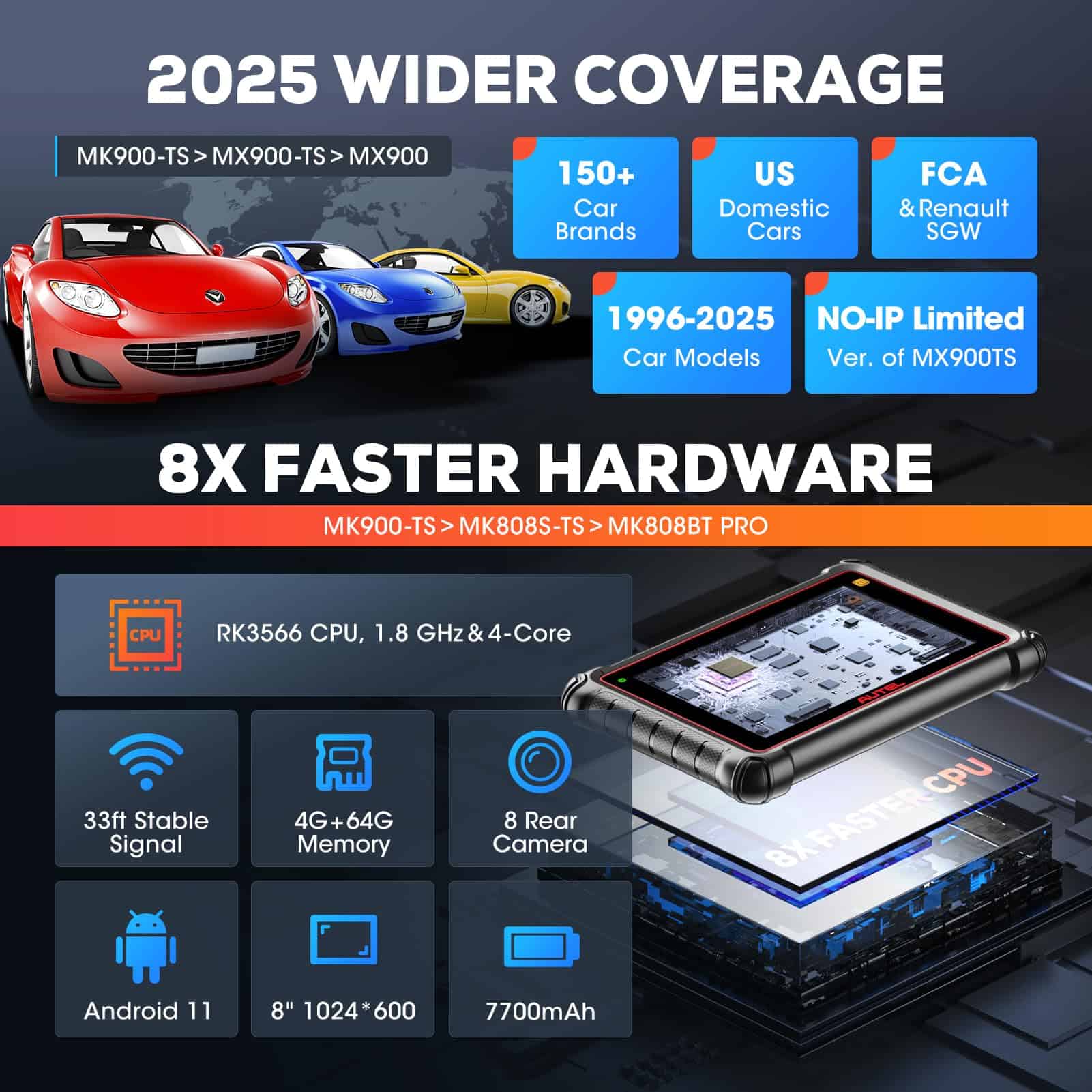 6. HARDWARE SUPERIOR, REAL FCA & RENAULT AUTOAUTH. Como el modelo más nuevo de MS906-TS/MK808S-TS/MX808S-TS, adopta un mejor Android 11.0 RK3566 quad-core CPU, Autel MK900-TS resolvió problemas históricos de software para garantizar que ya no se congele, más suave que MP808TS MK808S-TS MS906TS. 8 pulgadas 1280 800 4G&64G 5 y 2.4 GHz Dual WIFI 7700mAh Batería Más Grande, ofreciendo 5 veces más fluidez desde el diagnóstico hasta el TPMS. Además, Autel MK900-TS proporciona un espacio infinito en la nube de Autel, guardando más documentos de vehículos y datos de clientes.