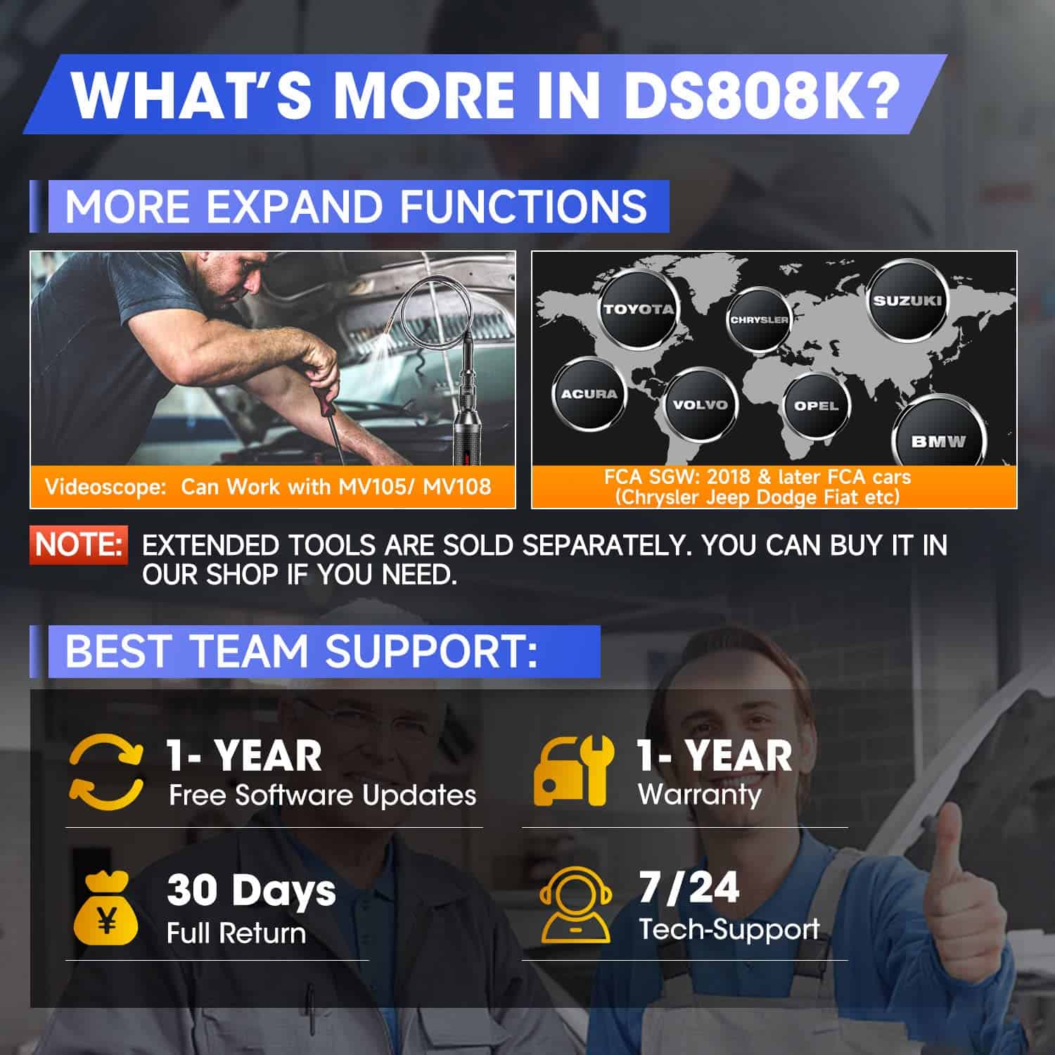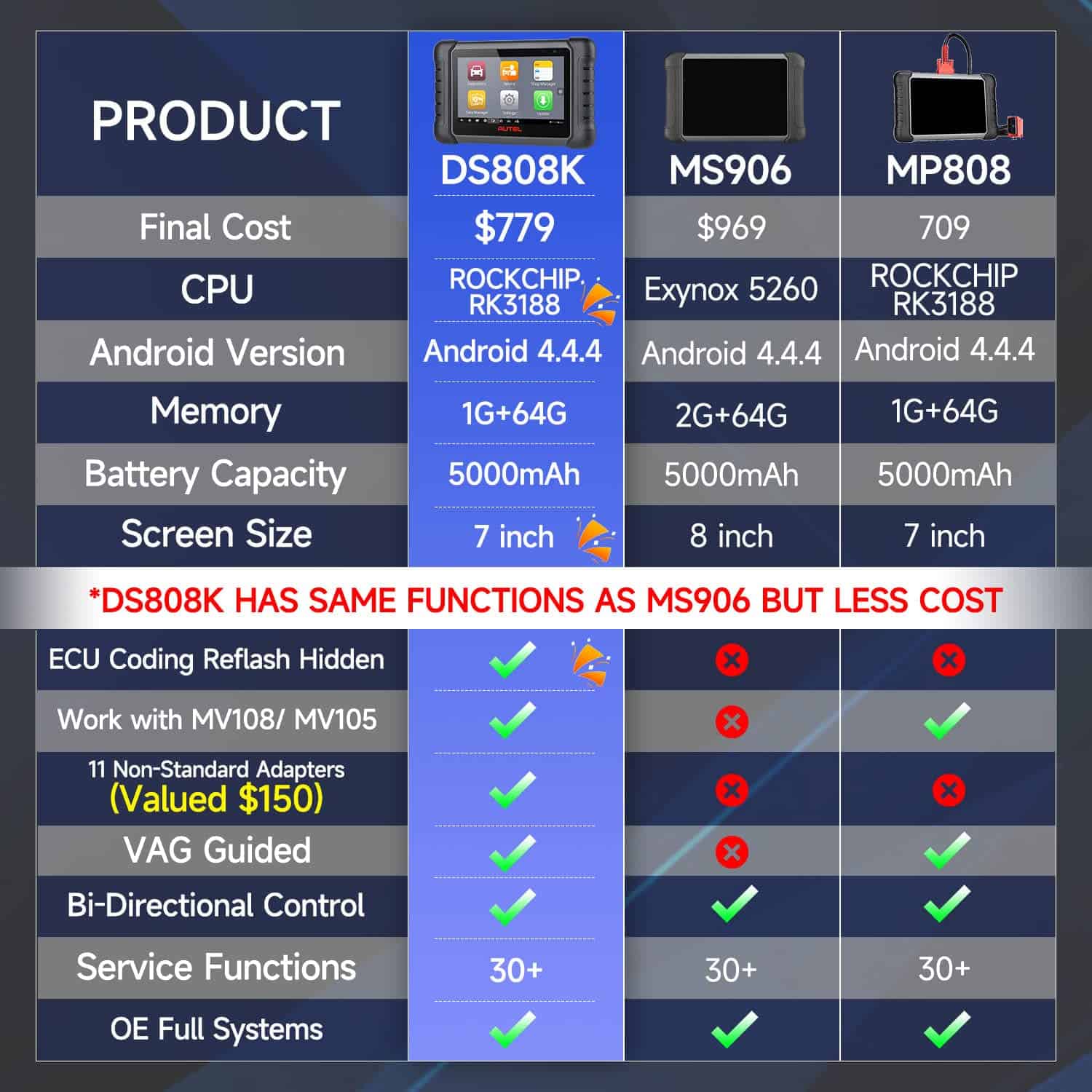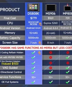 Autel Maxidas DS808K es la versión mejorada de DS708, que funciona tan potente como MS906, contiene capacidades completas para códigos, datos en vivo, prueba activa, información de ECU, adaptación, emparejamiento. Nuevo ecualizador añadido – Nuevas funciones agregadas El escáner Autel DS808K se ha actualizado por completo. Haga clic en «Actualizar» para actualizar el sistema a V2.62 y superior para obtener todo nuevo. Nueva Codificación de ECU agregada es compatible con Peugeot/ Citroen/ GM etc. Actualización de funciones ocultas y guiadas (compatible con Audi/ VW/ Skoda/ Jetta etc). Trabaje con MV108 para examinar Áreas de difícil acceso. Admite el inicio de sesión AutoAuth FCA 2018 y posterior como Chrysler, JEEP, Dodge, Fiat, etc. Función oculta de reprogramación, codificación de ECU como MS906 ¿Quiere llevar su automóvil de bajo a alto nivel? Con la misma codificación de ECU que el MS906, pero a menor costo. El escáner de diagnóstico automotriz Autel DS808K puede desbloquear las funciones ocultas para activar las características de autos de gama alta, como configurar el sonido de bloqueo, la memoria de inicio-parada, cancelar la declaración de encendido, espejos plegables automáticos, memoria de aire acondicionado, iluminación auxiliar de lámpara antiniebla, brillo de LED, etc. NOTA: Solo para Audi/VW/Skoda. Funciones avanzadas guiadas VAG Las funciones guiadas VAG brindan una guía detallada de operación con consejos correspondientes, inicio de sesión automático, emparejamiento, ajuste y codificación para autos VAG (VW, Audi, Skoda, S~eat, Man LD). No necesita preocuparse por no conocer los pasos en absoluto, simplificando el proceso de diagnóstico y acortando el tiempo de diagnóstico. Control bidireccional real sin adivinanzas ¿Qué haría si la luz trasera dejara de funcionar? ¿Reemplazar uno o gastar mucho dinero en arreglarlo? Este escáner de control bidireccional DS808K puede realizar una prueba activa que puede enviar comandos a la ECU para activar los actuadores para trabajar, como bombas de combustible, luces interiores, ventilador de aire acondicionado, espejos interiores, faro adaptativo, ventanas, sistema de lavado/limpieza, bocina, etc., ¡ahorrando tiempo y problemas! 30+ Funciones de Servicio Versión mejorada de DS808/ DS708/ MP808, igual que MS906. El escáner de diagnóstico DS808K viene con más de 30+ funciones de servicio/especiales como Reinicio de aceite, Reinicio EPB, Calibración SAS, Registro de baterías, Reinicio del acelerador, Sangría ABS, Codificación de inyectores, Equilibrio de potencia, Codificación de llaves, Calibración de suspensión, etc. NOTA: Todas las funciones especiales NO son universalmente compatibles. Por favor envíe el número de VIN a Autelonline @ outlook . com para verificar la compatibilidad. Diagnóstico de todos los sistemas de nivel OEM El escáner DS808K realiza un escaneo automático en todos los módulos de automóviles disponibles como ABS, SRS, EPB, SAS, BCM y etc., para leer/borrar códigos, mostrar datos en vivo, datos de congelación, análisis de códigos DTC, Auto VIN, etc. Con $200 completos 11 adaptadores OBDII no estándar, el escáner de diagnóstico automático DS808K 2024 puede acceder a más modelos de vehículos. Escaneo Auto VIN y Leer Información de ECU: la herramienta de escaneo automotriz DS808K cuenta con la última tecnología de Auto VIN basada en VIN y la función de escaneo automático para identificar la información de marca, modelo y año del vehículo y escanear todas las ECU del vehículo con un solo toque. Leer Info de ECU puede recuperar y mostrar la información específica para la unidad de control probada, incluido el tipo de unidad, números de versión, y etc. Actualización en línea de 12 meses y soporte técnico de por vida: Por favor envíenos un correo electrónico ofreciendo su modelo de automóvil detallado, año, VIN (importante) y las funciones que necesita verificar la compatibilidad antes de ordenar, obtendrá la solución disponible en 12 horas.