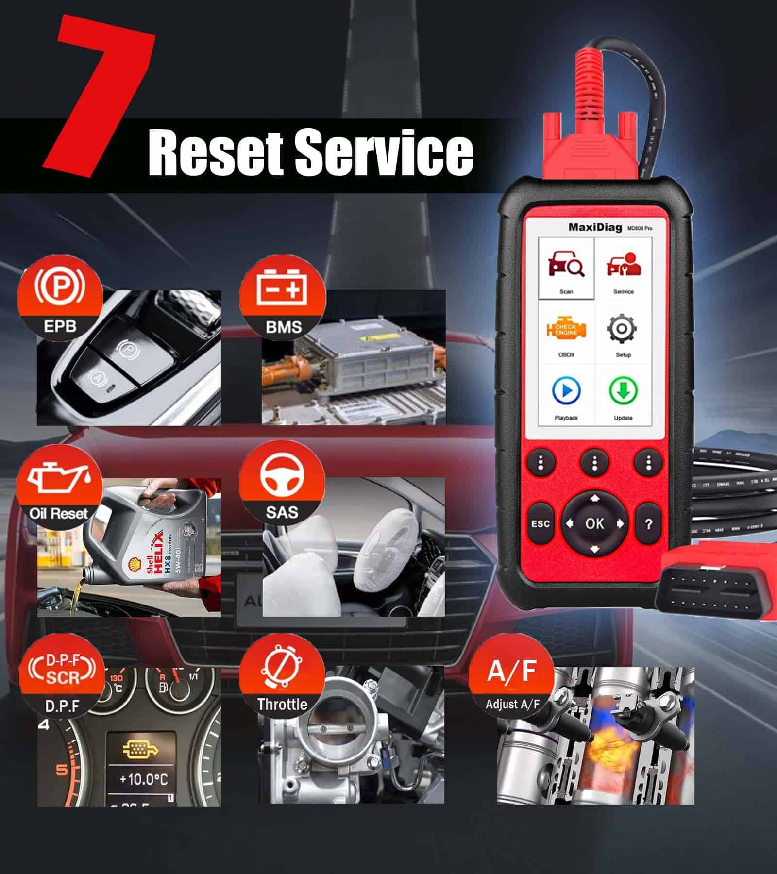 6. Múltiples Funciones y Servicios de Reinicio El escáner de diagnóstico de automóviles Autel MaxiDIAG MD808 Pro puede realizar los reinicios de servicio más comúnmente utilizados, incluyendo Reinicio de SAS, Reinicio de Aceite, Registro de Batería, Reinicio EPB, Regeneración DPF, Aprendizaje del Acelerador, Reinicio de Relación Aire/Combustible. Nota: el reinicio de servicio no funciona en todos los automóviles. ¡Verifica la compatibilidad antes de la compra!
