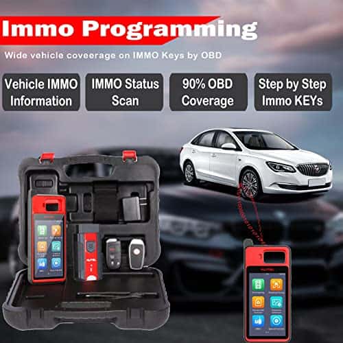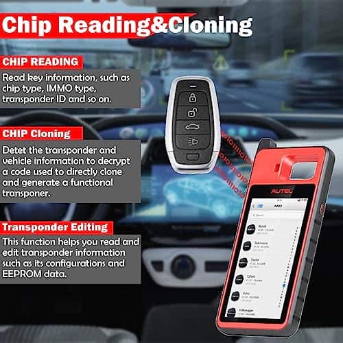 5. Lectura/Clonar/Editar Transpondedor El Autel MaxiIM KM100 te permite leer, clonar y editar la información del transpondedor. La lectura de transpondedores te da acceso a información básica relacionada con la llave, incluyendo tipo de chip, tipo de IMMO, ID del transpondedor, estado de bloqueo y modo de código. Puedes usar la clonación de transpondedores para descifrar un código que se utilizará para clonar y generar directamente un transpondedor funcional para tu vehículo. 6. Identificación AutoVin El Kit Generador de Llaves Universal Autel Car Key Programmer KM100 viene con VCI Bluetooth potente tableta Android 2GB de RAM/64GB de memoria interna batería recargable procesador Rockchip PX30 y sus características incluyen la identificación de vehículos AutoVin para garantizar precisión, Usado para identificación rápida de vehículos. 7. CHIP Lectura y Escritura Incluye la renovación de 36 Marcas de Vehículos compatibles y la Edición de Transponder de 20 protocolos compatibles. Puedes leer múltiples tipos de chips, tipos de IMMO, ID de transpondedor, estado de bloqueo, modo de código, etc.; generar un nuevo transpondedor funcional, editar la información del transpondedor e incluso simular este programador de llaves KM100 como un transpondedor para arranque de emergencia. La conversión entre los ID de transpondedor de Ford ID63 e ID83 también está disponible. 8. Incluye 2 IKEY En Blanco El KM100 de Autel viene con 2 llaves inteligentes Autel en blanco, que son compatibles con frecuencias de 315M/433M y 868M/915M, y pueden transmitir señales de hasta 130 pies (40 metros). Tenga en cuenta que KM100 no funciona con todos los automóviles, por favor verificar la compatibilidad.