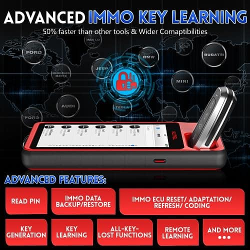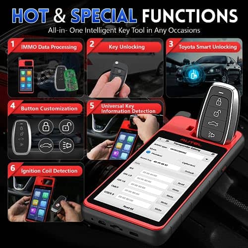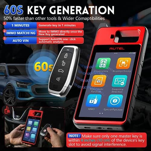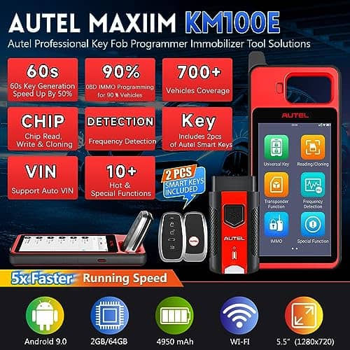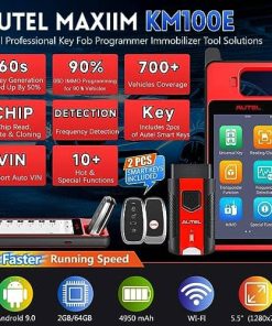 Autel MaxiIM KM100E se enfoca en la programación de llaves y funciones IMMO, un 50% más rápido que otras llaves (Más rápido que IM508/IM608/IM608 Pro). Amplia cobertura de llaves IMMO con KM100, llave programada como llave de reemplazo para más de 700 vehículos. Incluyendo BMW, Volkswagen, Toyota, Honda, GM, etc. Soporta un toque para Aprendizaje IMMO justo después de la generación de la llave. KM100E de Autel soporta el aprendizaje de llaves IMMO a través de OBD en el 90% de los vehículos en todo el mundo, ofrece instrucciones paso a paso para emparejar la nueva llave con el inmovilizador. La Herramienta de Programación de Llaves KM100(E) de Autel puede recuperar información IMMO del vehículo, realizar el aprendizaje de la llave, aprendizaje del control remoto, adición de control remoto y otras funciones relacionadas con IMMO. KM100 de Autel incluye la capacidad de escaneo de licencia AutoVIN, identificando con precisión los datos del vehículo con un solo toque.