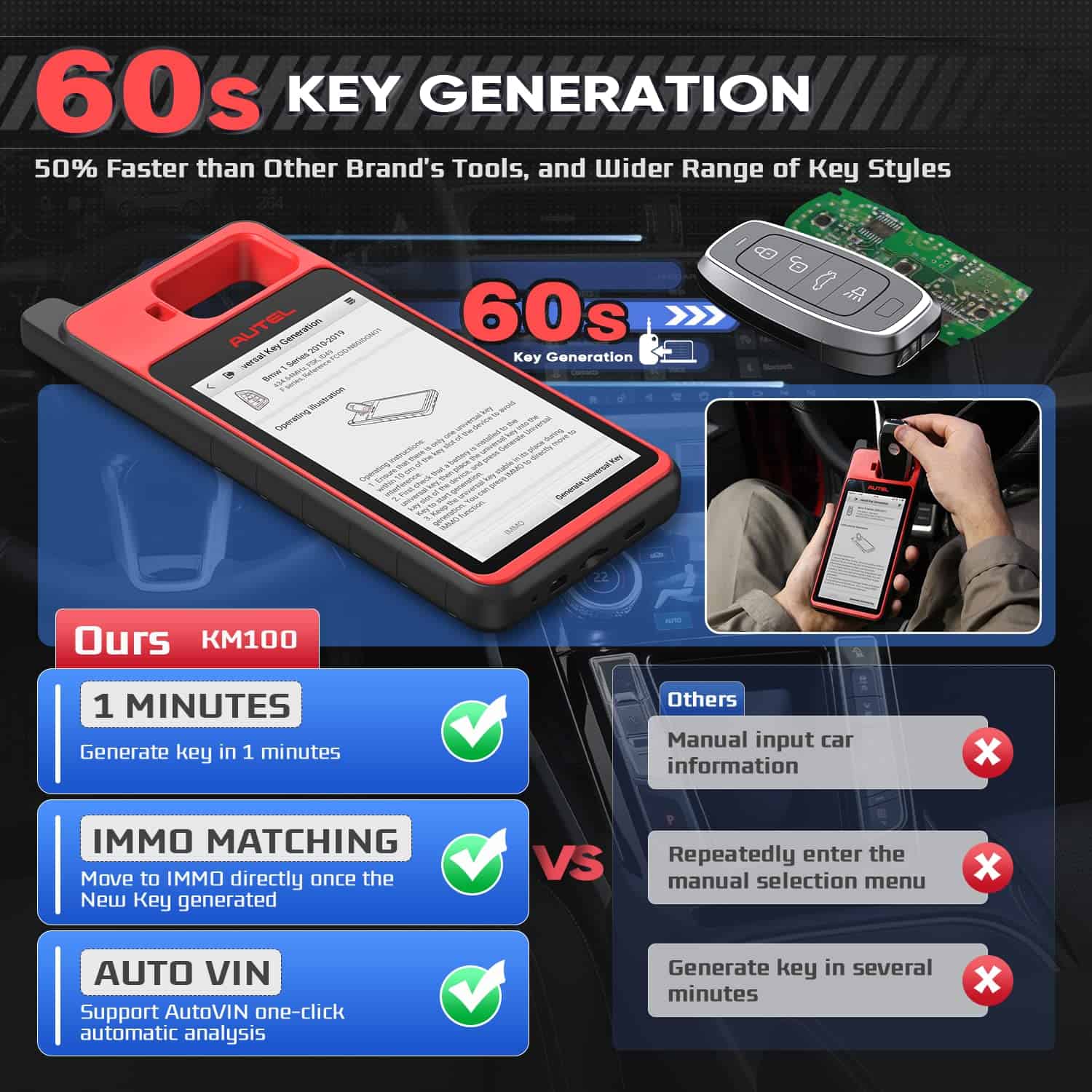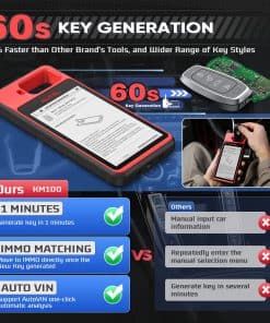 3. Generación de Llaves Universales en 60s, 50% Más Rápido que Otros Como recomiendan los cerrajeros, es muy fácil crear llaves inteligentes a través de la herramienta KM100 con una pantalla táctil de 5.5 pulgadas y Bluetooth VCI. De hecho, comparado con los modelos antiguos IM508/IM608 de Autel y otros, el KM100X más nuevo de 2024 puede programar el IKEY de Autel como una llave inteligente de reemplazo para más de 700 vehículos en 60s, acelerando en un 50%. Además, soporta AutoVIN para identificar vehículos con solo un toque. También una pulsación para el Aprendizaje de IMMO justo después de la generación de llaves.