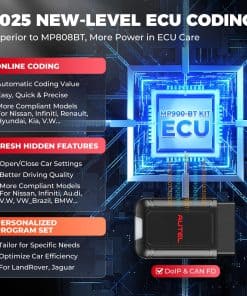Autel MaxiPRO MP900-BT KIT Scanner: Nivel 2025 de MP900Z-BT, MP808BT Pro, MP808BT KIT con DoIP CAN-FD, 40+ Servicios, Codificación de ECU OE, 11 Cables OBD1, Bi-direccional, 150+ Marcas, FCA Renault SGW. 1. Lanzamiento nuevo en 2025, Nivel completo de las series MP808BT & MS906BT. Estarás encantado de tener el más reciente Kit MP900-BT de Autel: más rentable que la mayoría de los escáneres Autel (series MP808BT/MS906BT). Más funciones, cobertura más amplia y hardware 5 veces más rápido para apoyar mejor tu trabajo: Codificación de ECU OE, Pruebas activas, 40+ Servicios…, CAN-FD, DoIP, 150+ Marcas, 500,000 Modelos, FCA y Renault SGW, etc. que son exclusivos de los escáneres de gama alta de Autel, 3 veces más que los costos. También agrega adaptadores OBD1 de 200 dólares de valor. 2. 11 Adaptadores OBD y Hardware 5 Veces Más Rápido. ¿Por qué elegir el Kit MP900-BT, no MP808BT PRO? El nuevo Kit MP900-BT…